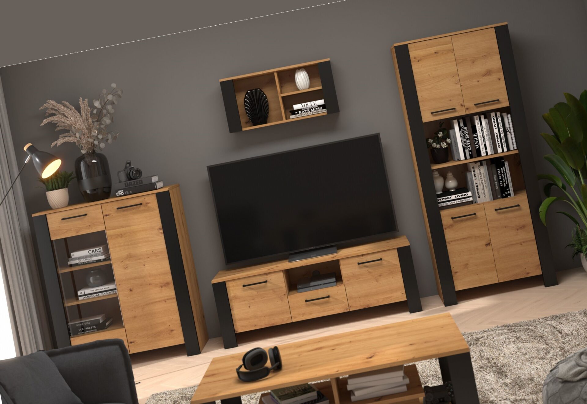 DELIS baldų komplektas Nr. 1, vitrinos komplektas, TV spintelė, lentyna, ąžuolas, juoda