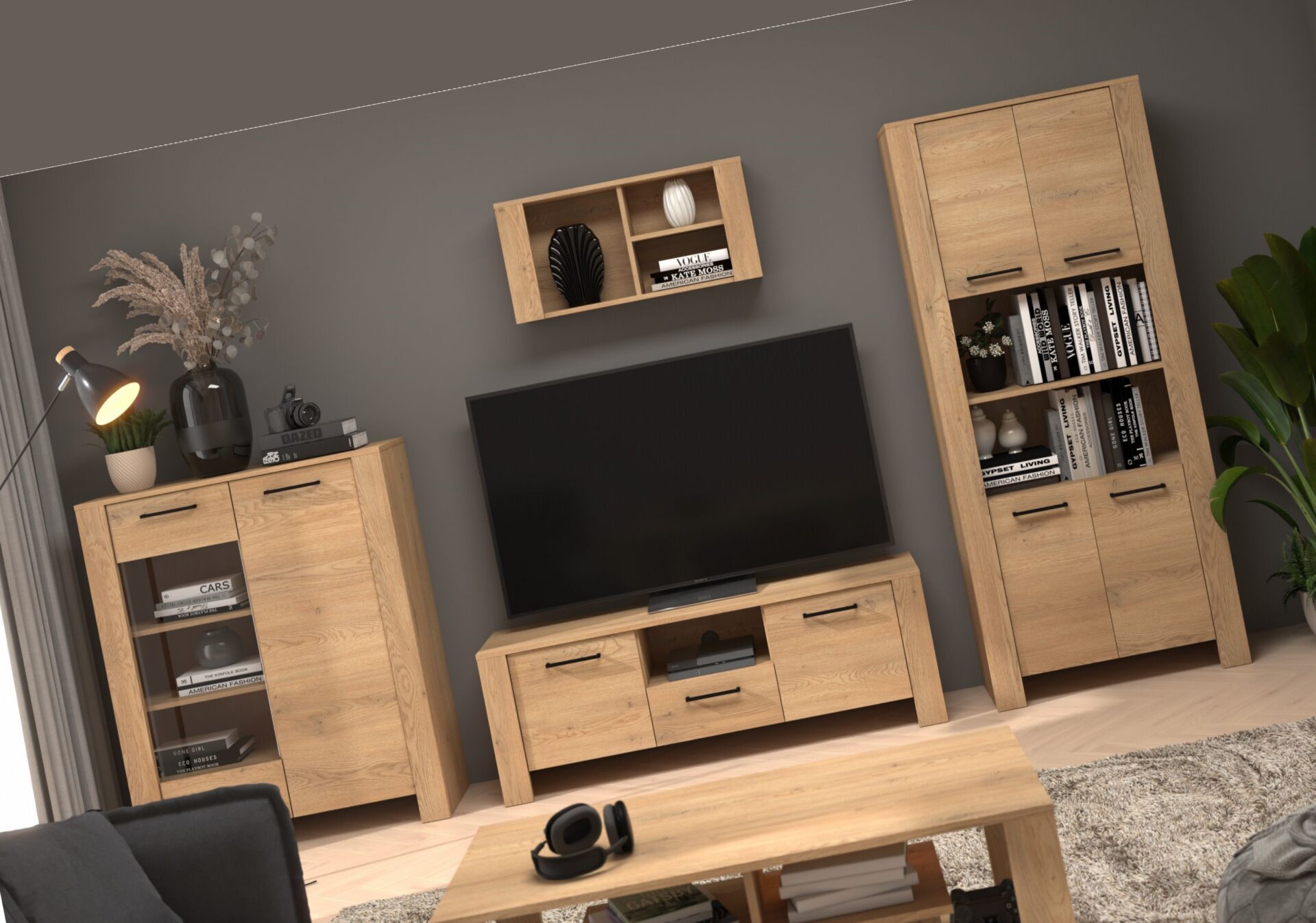 DELIS baldai #1 komplektas: vitrina, televizoriaus spintelė, lentyna, ąžuolas „Cremona“