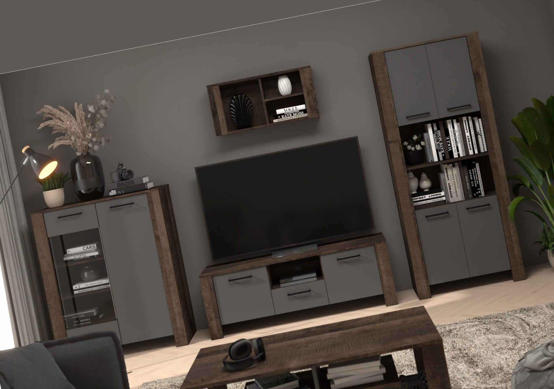 DELIS baldai #1 komplektas: vitrina, televizoriaus spintelė, lentyna, ąžuolas, granido spalvos, grafitas