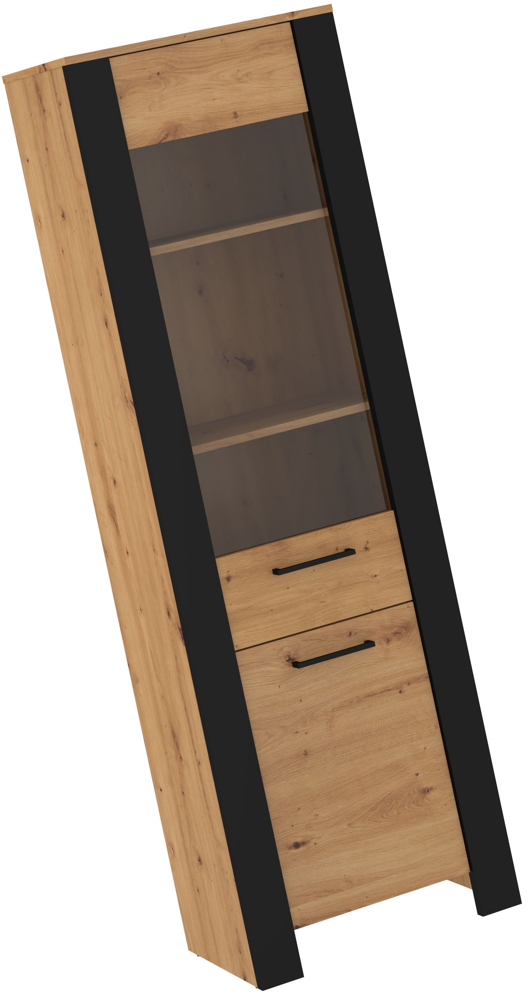 Узкий высокий шкаф-витрина DELIS 15 для гостиной. Материалы: ДСП толщиной 16 мм и 25 мм, кромка из ABS-пластика, доводчики. Цвет: дуб ручной работы / черный.