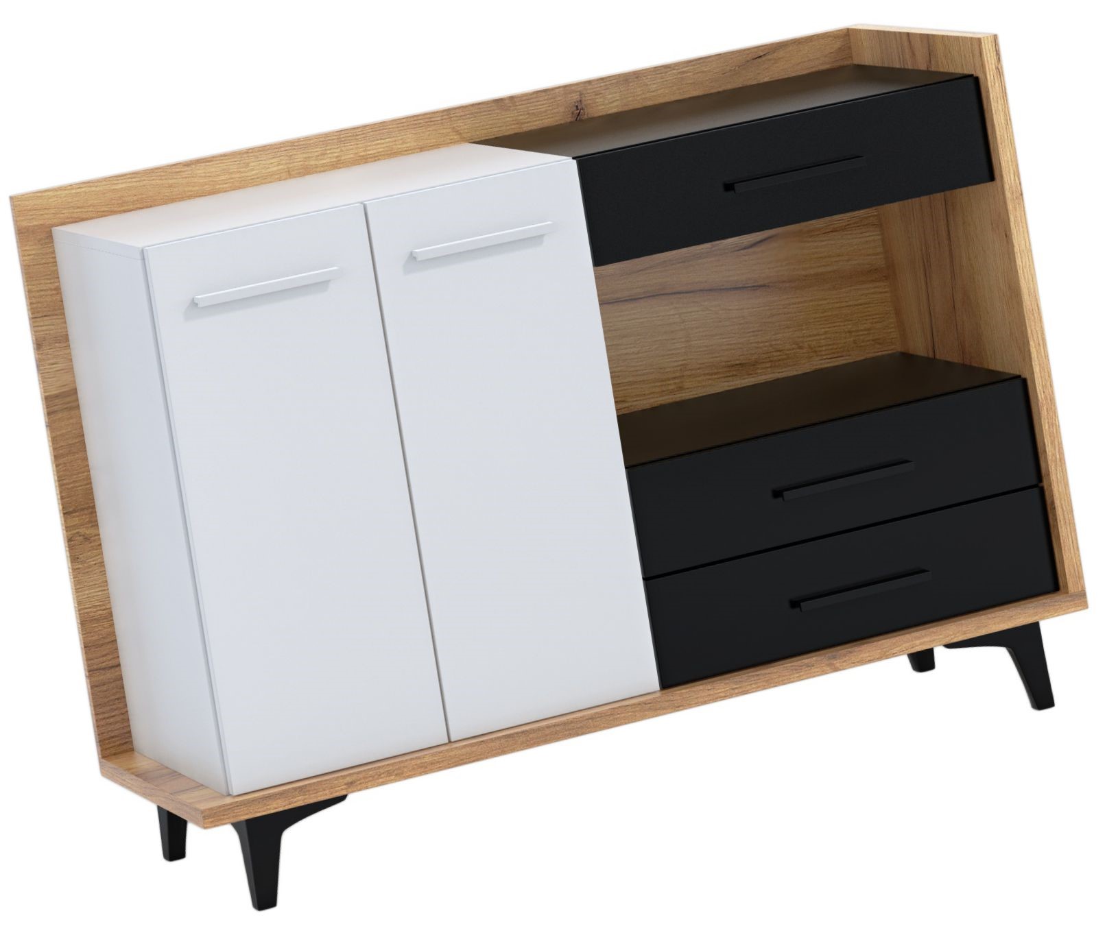 DOX 02 baldai, didelė spintelė svetainei, komoda, balta, juoda