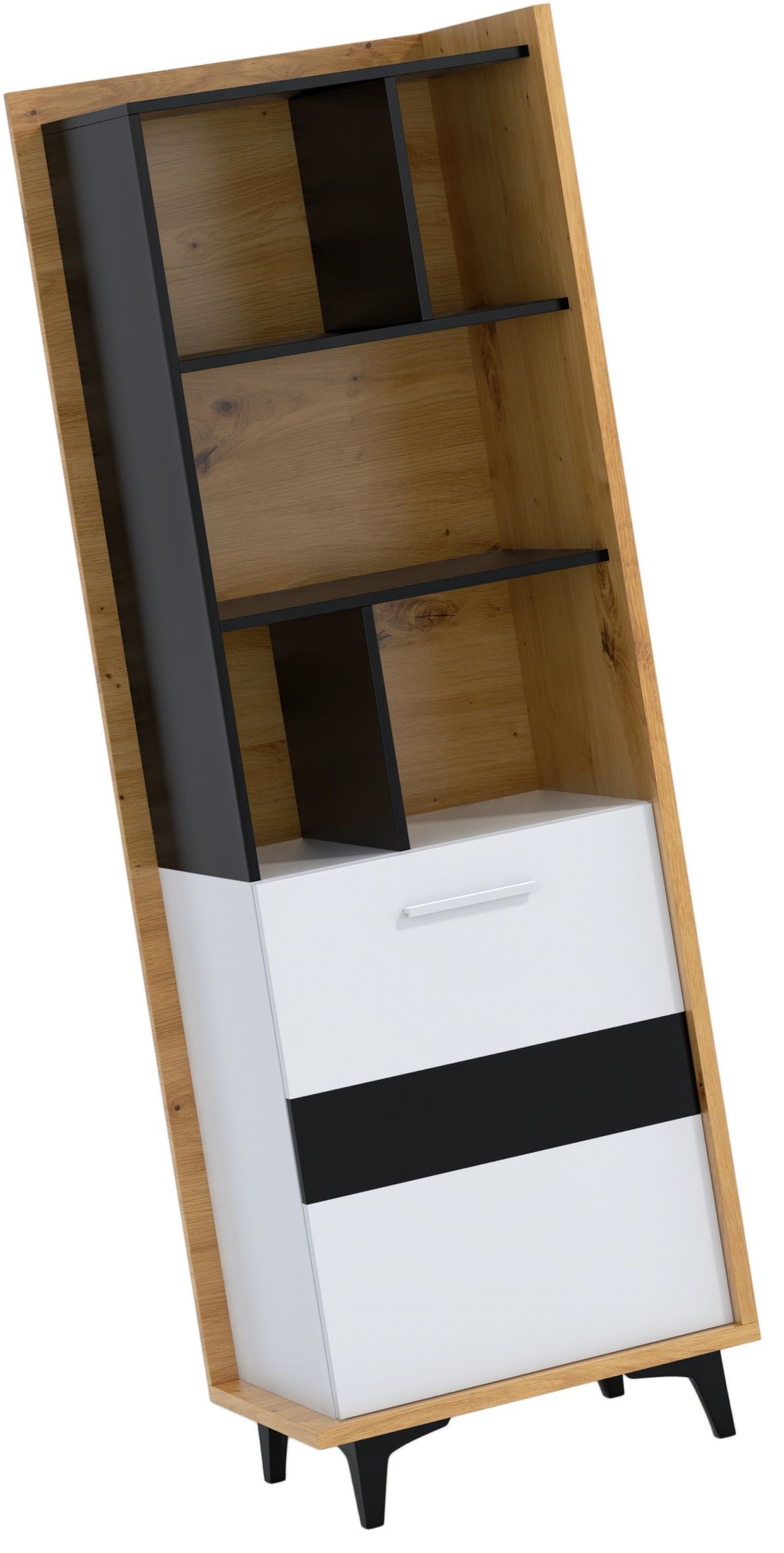 DOX 06 baldų knygų lentyna su lentynomis ir durelėmis, ąžuolo dirbiniai, balta, juoda