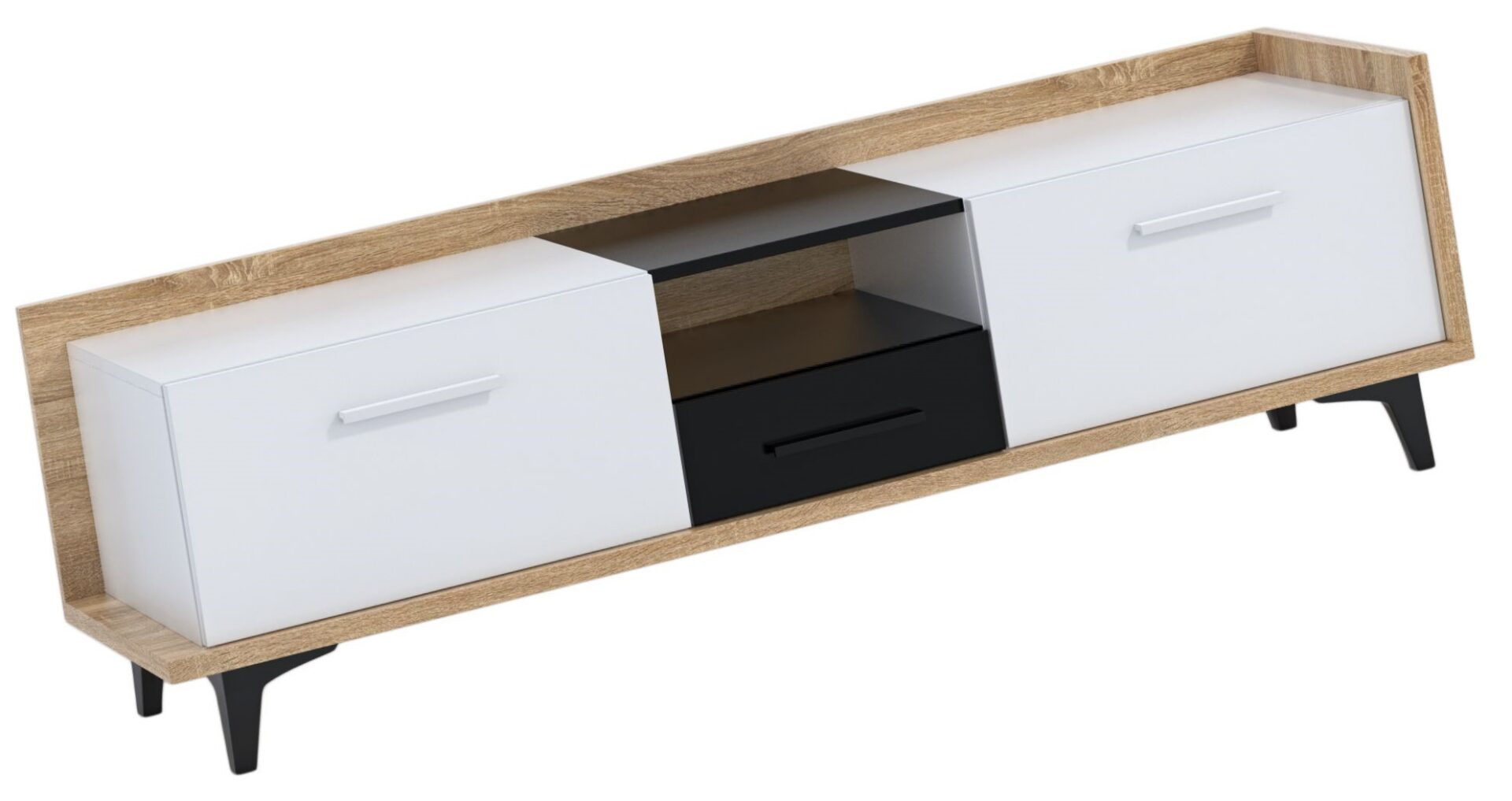 DOX 09 baldai, didelė komoda, stalas, TV spintelė su stalčiumi, Sonoma, balta, juoda