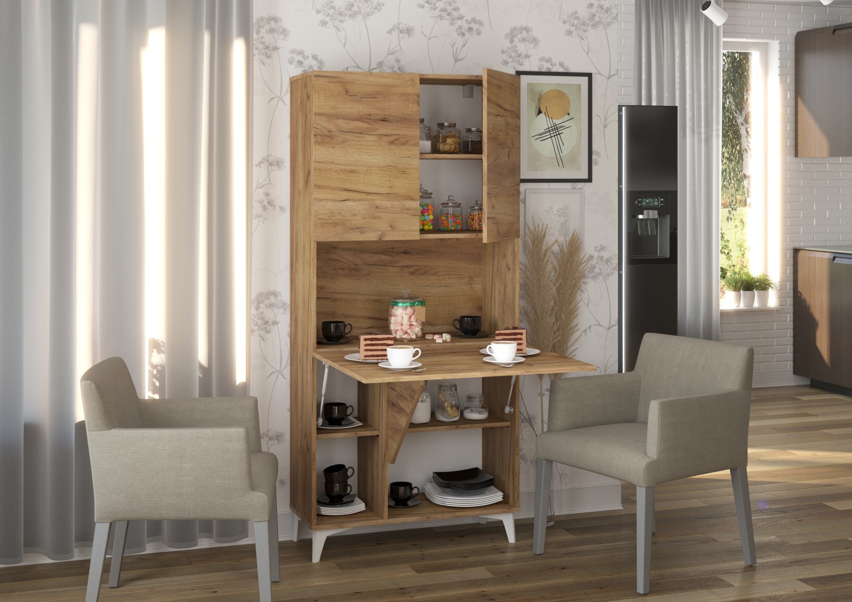 Мебель изготовлена из ДСП толщиной 16 мм с кромкой из АБС-пластика. Ящики и дверцы оснащены механизмами плавного закрывания. Высота ножек из АБС-пластика составляет 12 см.