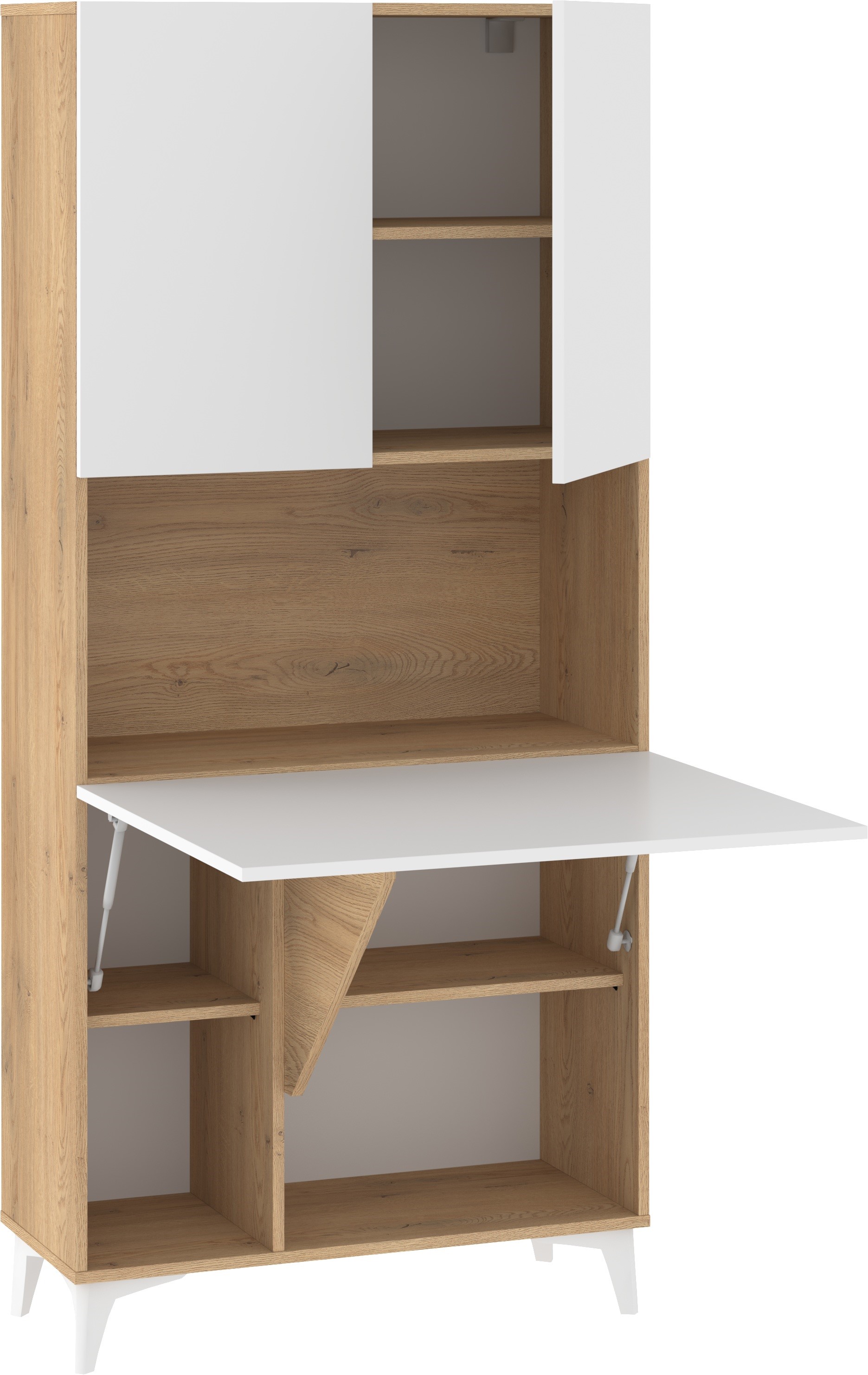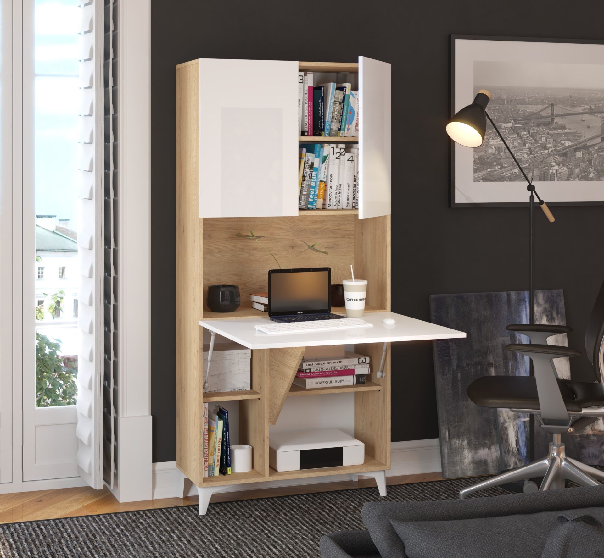 MEGI baldai 1 knygų lentyna + sulankstomas stalas, kremonos ąžuolas / baltas blizgus