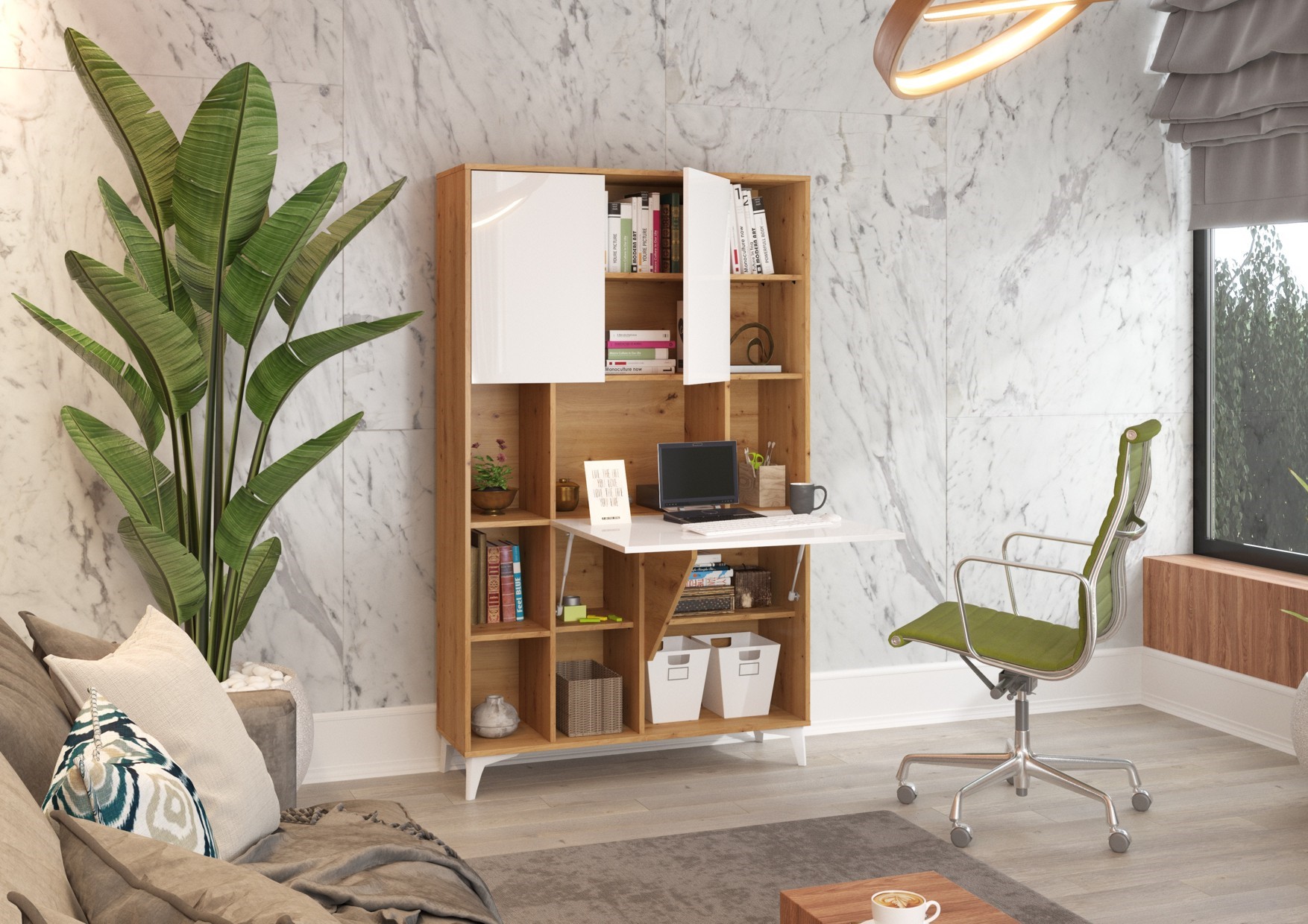 MEGI 2 baldai, knygų lentyna + rašomasis stalas, ąžuolas „artisan“ / balta blizgi