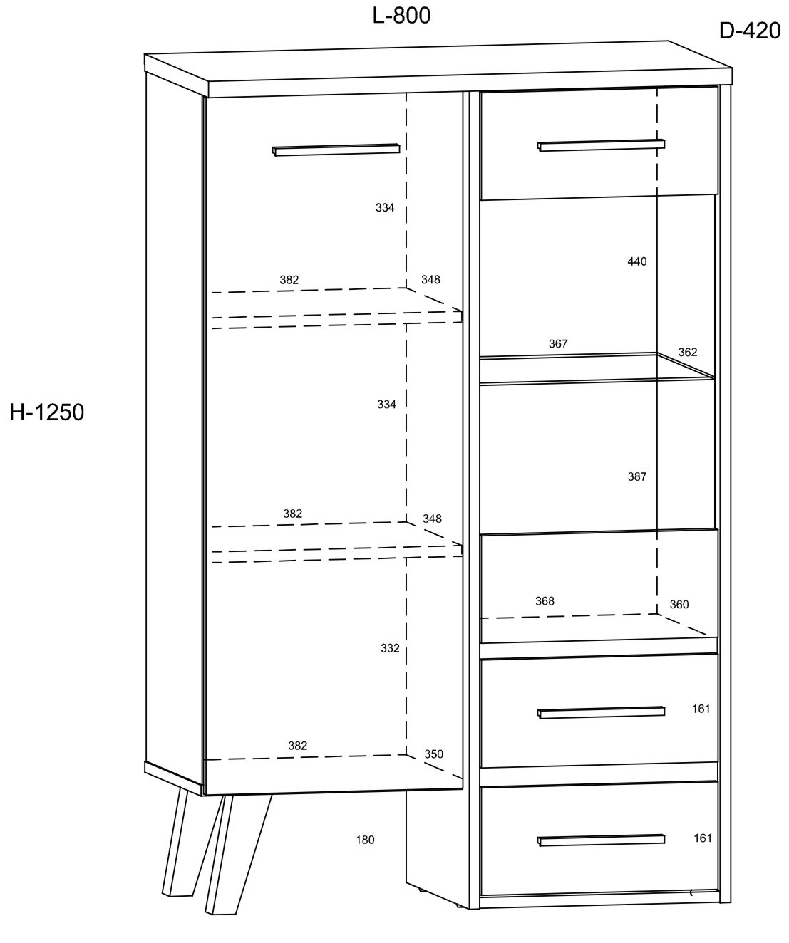 Мебель изготовлена из ДСП толщиной 16 мм и 25 мм с кромкой из АБС-пластика. Ящики и дверцы оснащены механизмом плавного закрывания. Высота деревянных ножек составляет 18 см.