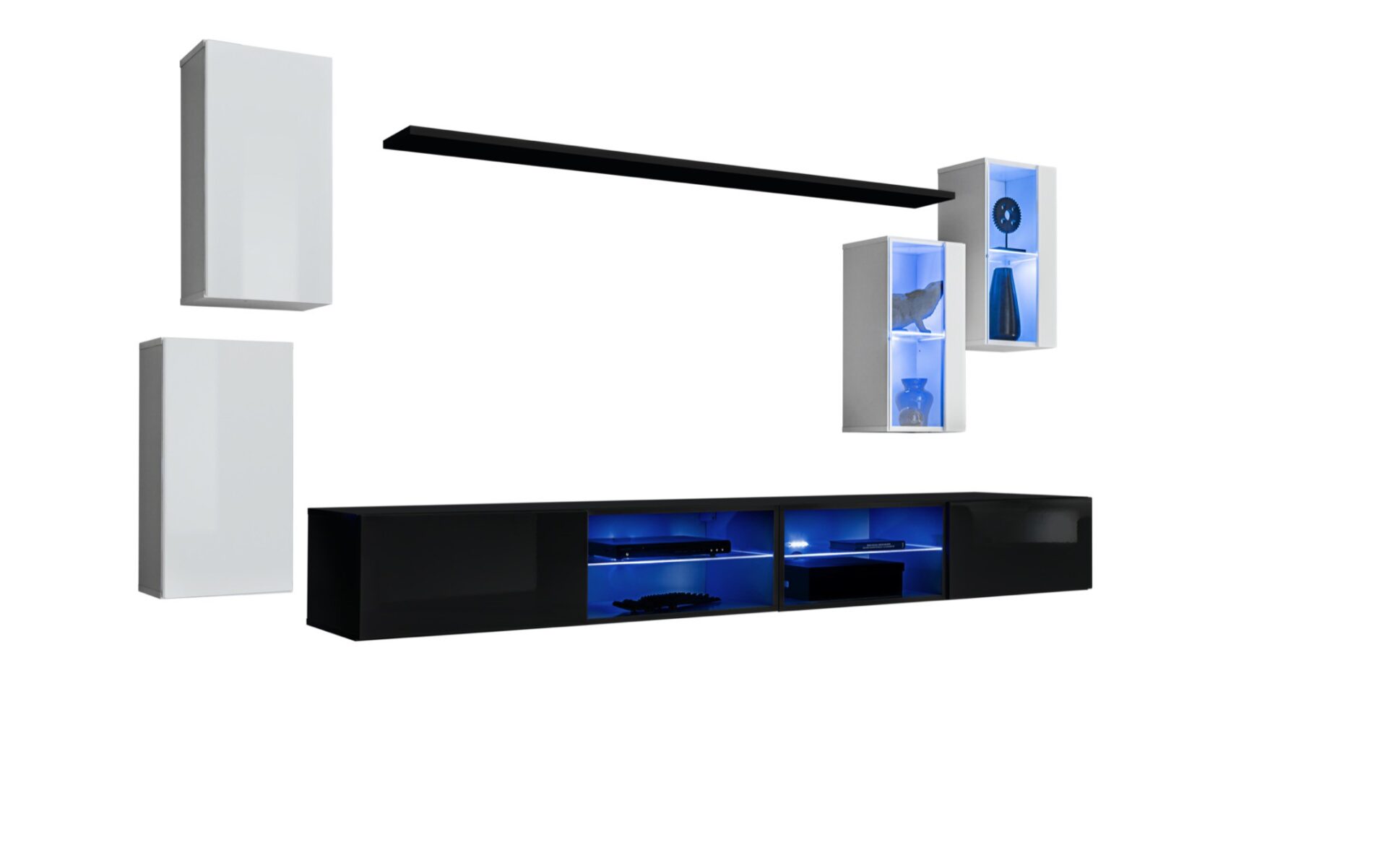 2 настенных шкафа: дверцы, за ними 1 стандартная полка (2 отделения). Полка. 2 настенных витрины: частично застекленные дверцы, за ними отделение со стеклянной полкой, подсвеченной синей светодиодной подсветкой. 2 тумбы под телевизор: отделение со стеклянной полкой, подсвеченной синей светодиодной подсветкой, рядом с которой находится откидная дверца на газовых амортизаторах, за которой находится открытое отделение. Передние панели открываются с помощью механизма «нажать-щёлкнуть».