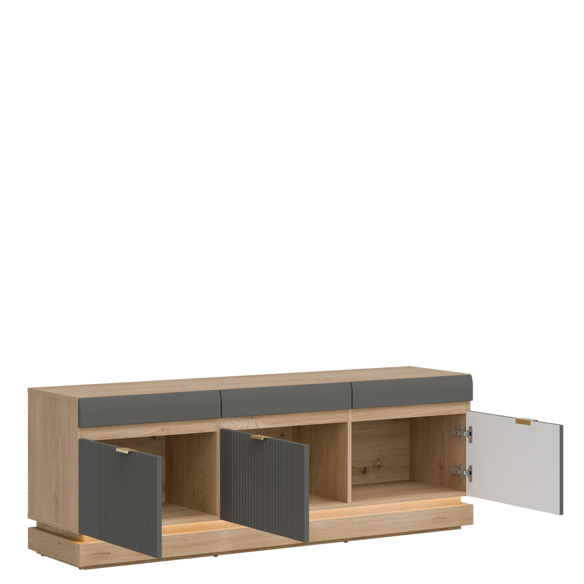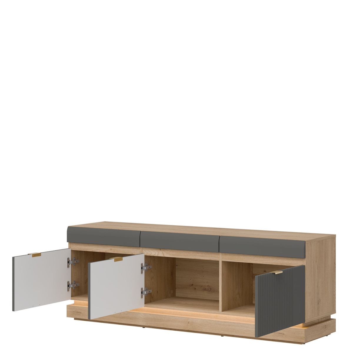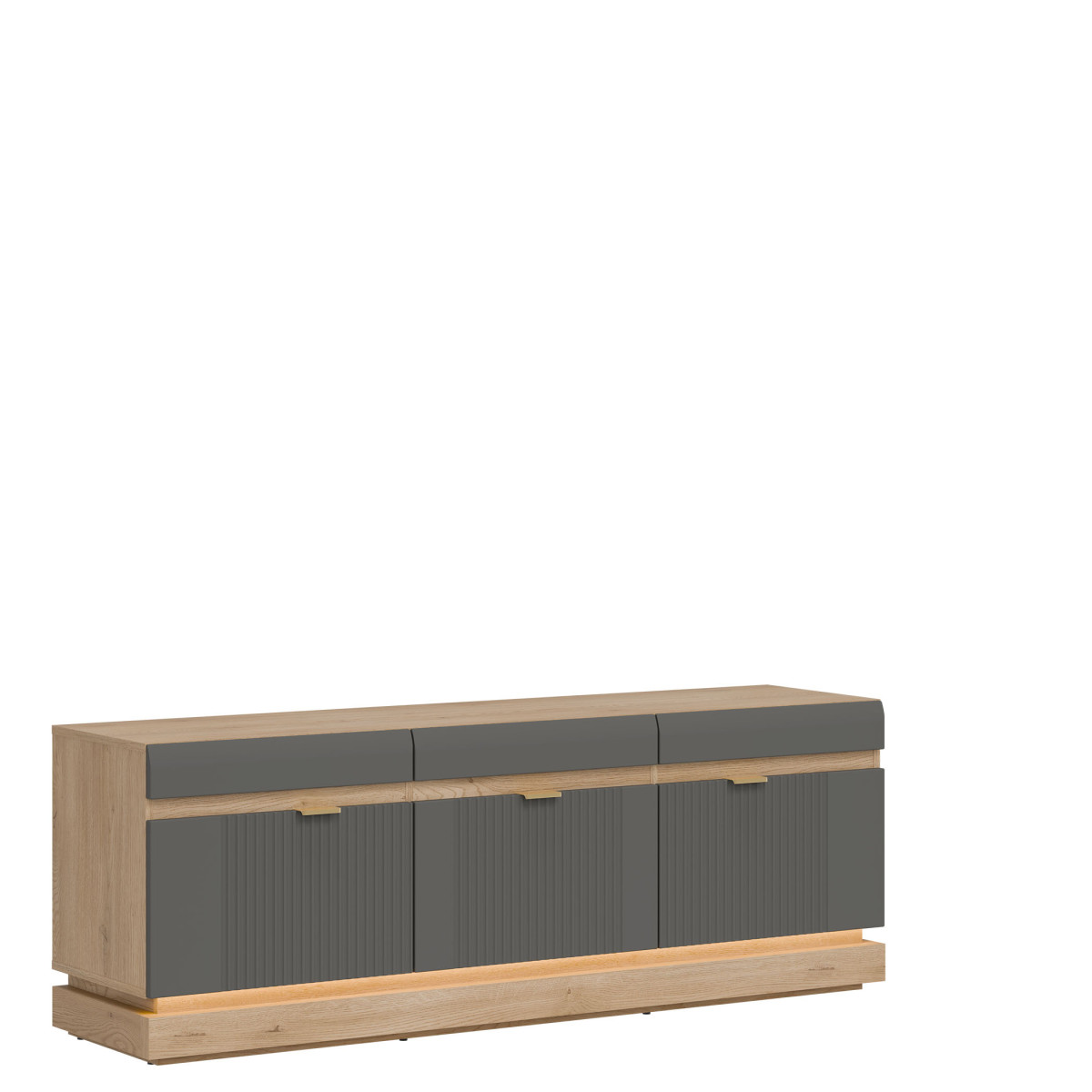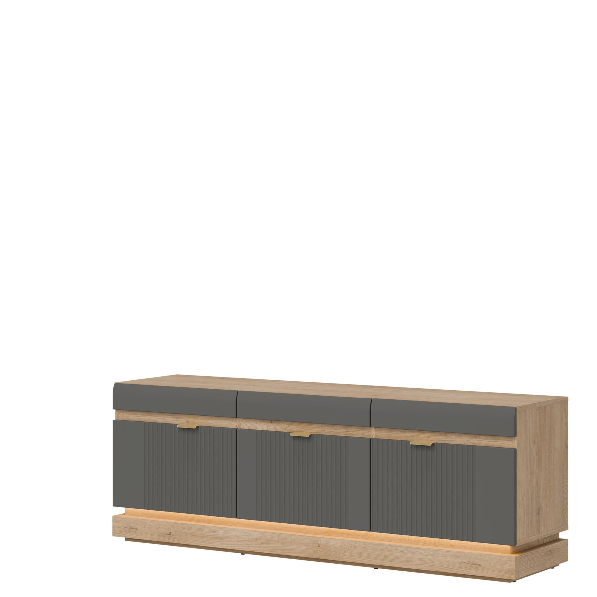 Тумба под телевизор ML01 из коллекции MILTON — это уникальное сочетание современного дизайна и вневременной элегантности. Фасады из МДФ с модной матовой отделкой доступны в нескольких стильных цветовых вариантах — от светлых до глубоких тонов — и дополнены тонкой вертикальной фрезеровкой, придающей изделию изысканный характер. Золотистые ручки добавляют элегантности, а опциональная светодиодная подсветка внизу создает уютную атмосферу и подчеркивает легкость формы. Корпус с отделкой «Дуб Кремона Торро» привносит естественное тепло в интерьер и идеально дополняет разнообразную цветовую палитру фасадов, создавая гармоничную современную композицию. Изделие обеспечивает практичное хранение телевизора и мультимедийных аксессуаров, сохраняя при этом эстетику пространства. Это идеальный вариант для тех, кто ценит функциональность и стиль, прекрасно дополняющий как минималистичный, так и более классический дизайн гостиной.