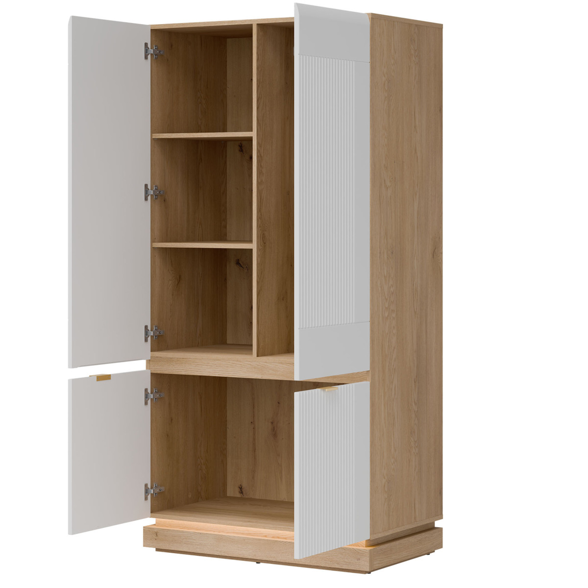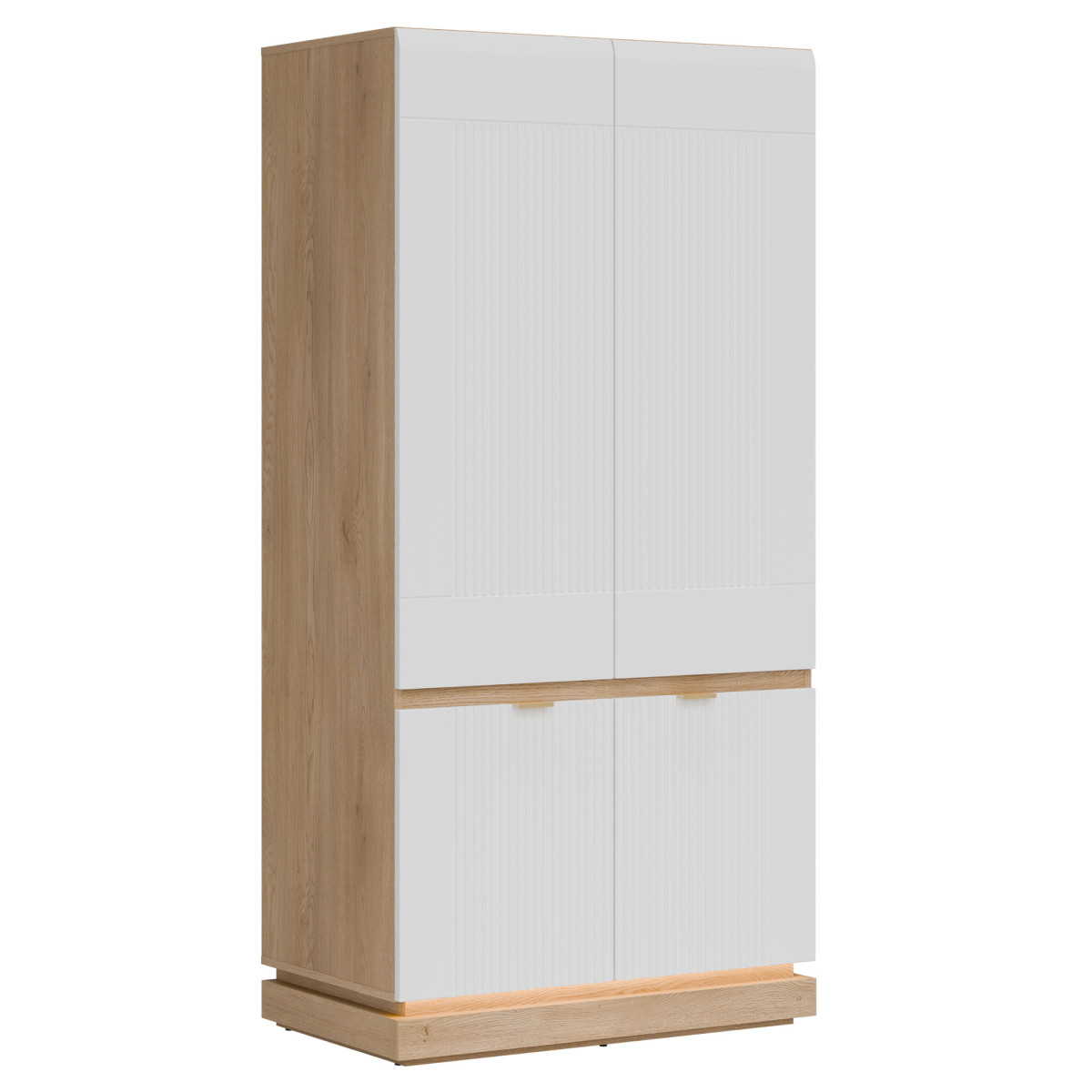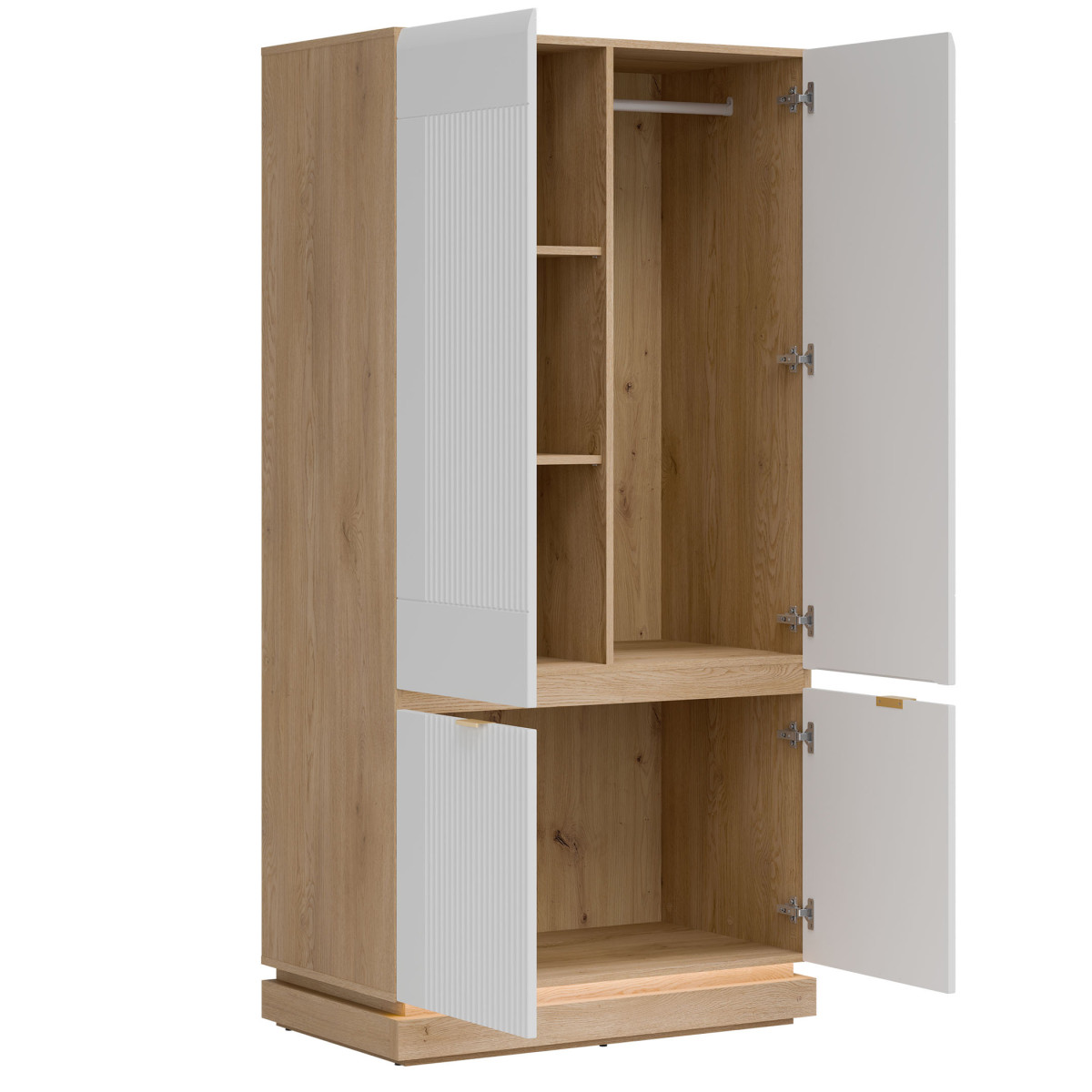 Ширина 95 см, глубина 55,5 см, высота 193,5 см, вес изделия с упаковкой 84,60 кг. Код/символ производителя ML08. Название коллекции MILTON. Название в системе b2b: MILTON ML08 CREM OAK TORRO WHITE WARDROBE 2DKPL. Количество упаковок: 3. Стиль: Модерн. Комплектация: Инструкция по сборке / аксессуары для сборки. Сборка: Самостоятельная сборка. Цвет корпуса: Cremona Torro Oak. Материал/тип/толщина корпуса: ДСП 16 мм. Материал/тип/толщина верхней части корпуса: ДСП 16 мм. Материал/тип/толщина нижней части корпуса: ДСП 16 мм. Материал/тип/толщина основания корпуса: ДСП 32 мм (2 x 16). Цвет полок: Cremona Torro Oak. Материал/тип/толщина полок: ДСП 16 мм. Количество полок: 2. Материал/тип/толщина задней стенки: ДСП HDF 2,5 мм. Цвет видимой части задней стенки: Artisan Oak. Цвет передней панели: Матовый белый. Материал/тип/толщина отделки передней панели: Мебельная плита МДФ 18 мм. Передняя петля ⌀ 35 мм, регулируемая в трех плоскостях. Передняя ручка / отделка / цвет: алюминий / золотистый. Система плавного закрывания дверей: стандартная. Ножка / отделка / цвет: нерегулируемая / мебельные направляющие / пластик / черный. Количество дверей: 4. Количество закрытых ниш: 5. Комплектация: стандартная. 1 вешалка.