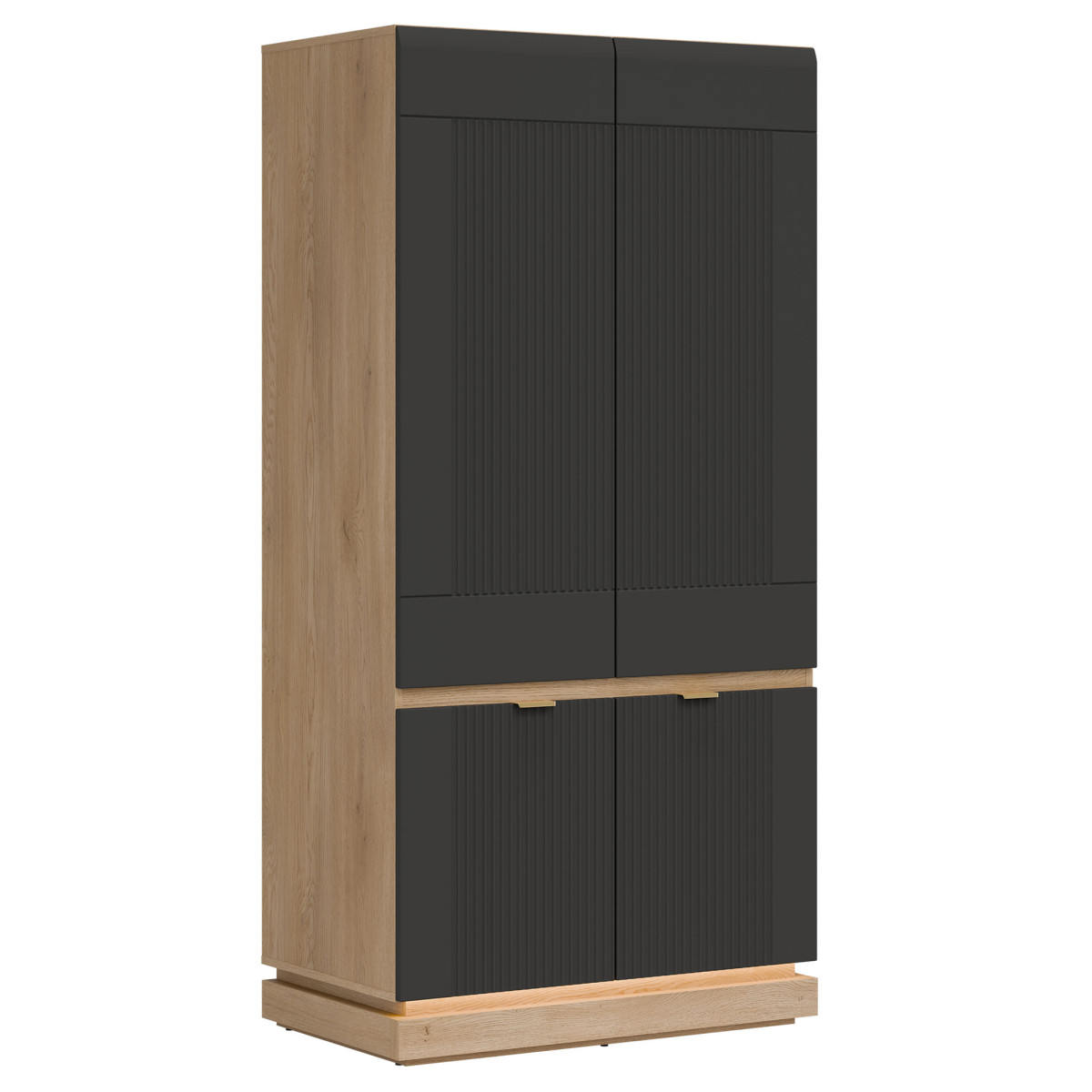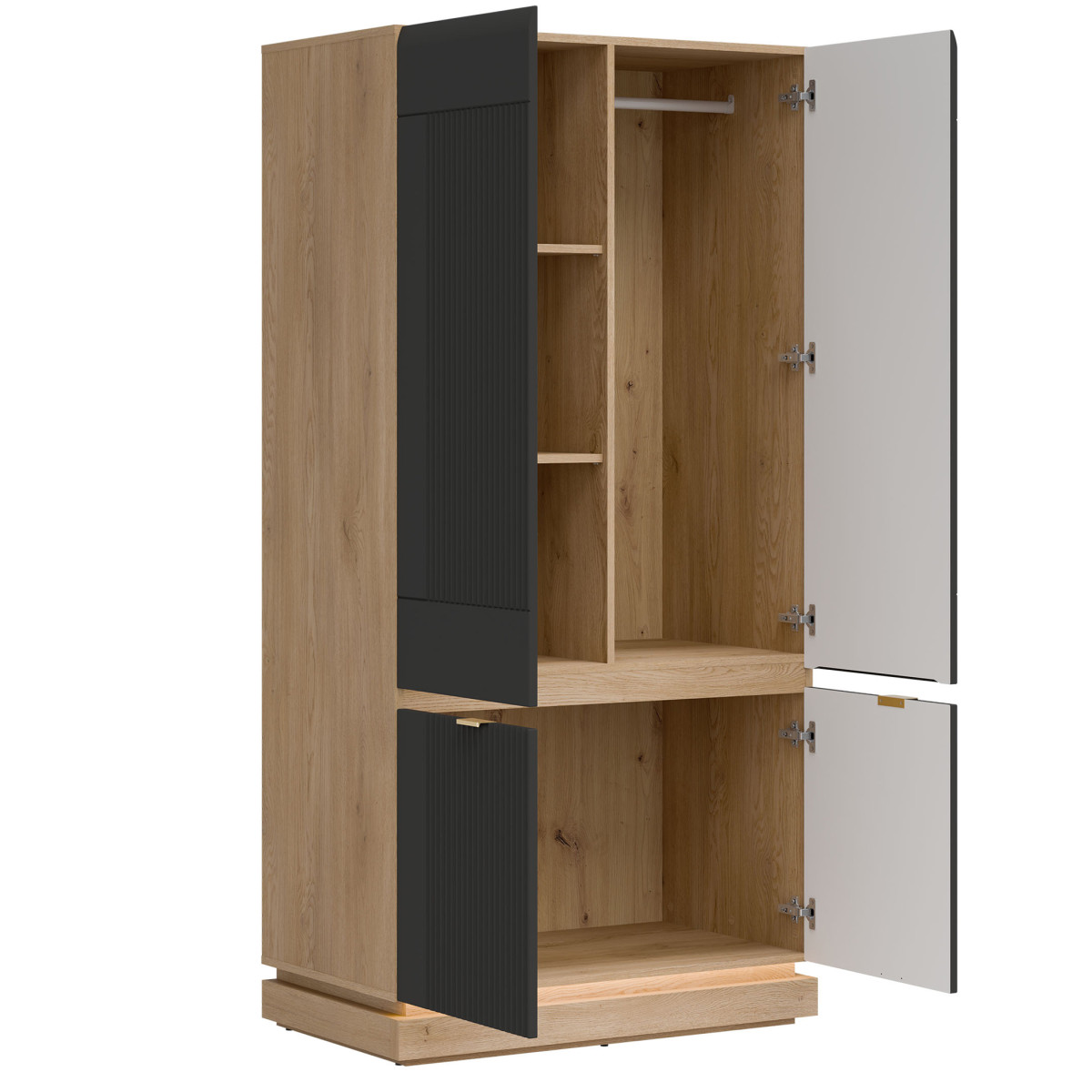 Ширина 95 см, глубина 55,5 см, высота 193,5 см, вес изделия с упаковкой 84,60 кг. Код/символ производителя ML08. Название коллекции MILTON. Название в системе b2b: MILTON ML08 CREM OAK TORRO ANTHRACITE WARDROBE 2D SET. Количество упаковок: 3. Стиль: Модерн. Комплектация: Инструкция по сборке / аксессуары для сборки. Сборка: Самостоятельная сборка. Цвет корпуса: Cremona Torro Oak. Материал/тип/толщина корпуса: ДСП 16 мм. Материал/тип/толщина верхней части корпуса: ДСП 16 мм. Материал/тип/толщина нижней части корпуса: ДСП 16 мм. Материал/тип/толщина основания корпуса: ДСП 32 мм (2 x 16). Цвет полок: Cremona Torro Oak. Материал/тип/толщина полок: ДСП 16 мм. Количество полок: 2. Материал/тип/толщина задней стенки: ДСП HDF 2,5 мм. Цвет видимой части задней стенки: Artisan Oak. Цвет передней панели: Матовый антрацит. Материал/тип отделки передней панели. Толщина 18 мм, мебельная плита МДФ. Передняя петля ⌀ 35 мм, регулируемая в трех плоскостях. Передняя ручка / отделка / цвет: алюминий / золотистый. Система плавного закрывания дверей: стандартная. Ножка / отделка / цвет: нерегулируемая / мебельные направляющие / пластик / черный. Количество дверей: 4. Количество закрытых ниш: 5. Комплектация: стандартная. 1 вешалка.