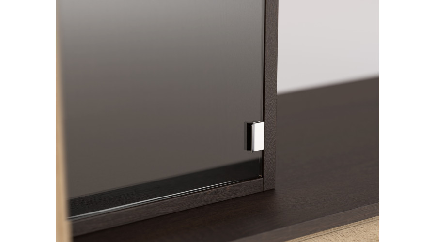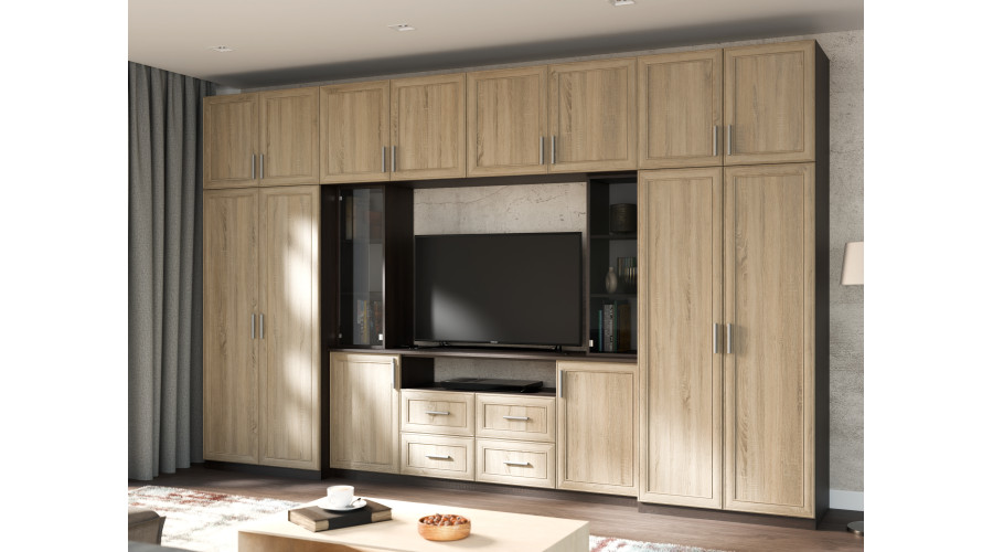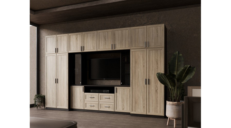 Центральная зона для телевизора позволяет удобно разместить телевизор и мультимедийное оборудование. Тумба для мультимедийной техники и просторные ящики помогают организовать аксессуары для телевизора, документы и мелкие предметы, поддерживая целостный и эстетически привлекательный вид гостиной. Верхняя часть комплекта образована выступающими элементами высотой до потолка, включая телевизионные выступы с дверцами из тонированного стекла, которые служат элегантными витринами. Остекление разбавляет массивную конструкцию и создает визуальную легкость, а также позволяет демонстрировать декоративные элементы или мебель.
