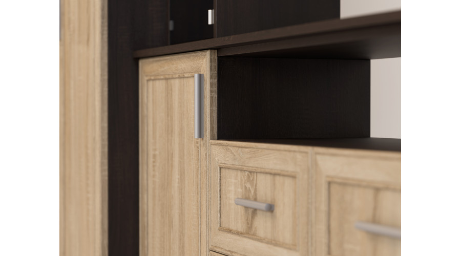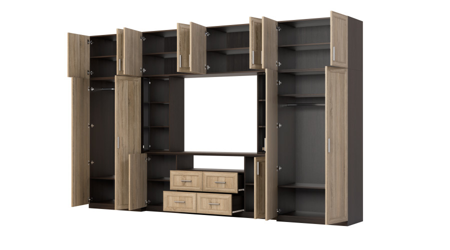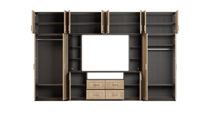 Этот модульный шкаф был спроектирован с учетом максимальной вместимости. Два высоких боковых шкафа, оборудованные полками и вешалками, обеспечивают достаточно места для хранения одежды, текстиля и сезонных вещей. Это позволяет использовать шкаф также в качестве гардеробной, что особенно практично в квартирах с ограниченным пространством.