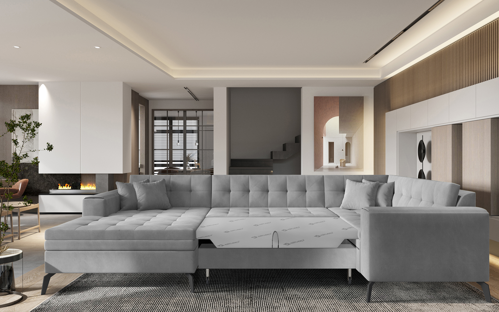 Угловой диван Montez — это просторный, удобный и обитый тканью диван внушительных размеров: 340 x 180 x 93 см. Этот U-образный предмет мебели идеально подходит для больших помещений. Он оснащен удобным, мягким сиденьем из прочных пружин и гибкого пенополиуретана T30, устойчивого к повреждениям, царапинам и вмятинам. Наш угловой диван многофункционален, так как легко трансформируется в кровать. После раскладывания дивана с помощью автоматического механизма DL вы получаете вместительное пространство 275 x 120 см для ночного отдыха. Характерными особенностями углового дивана Montez являются высокое сиденье (51 см), элегантная стежка, высокие стальные ножки (13 см) и широкий выбор цветовых решений. Изделие доступно во всех тканях из коллекции BalduMarket. Montez — это стильный, элегантный и, прежде всего, удобный угловой диван, который идеально впишется в любую большую гостиную. Стоит приобрести такой многофункциональный предмет мебели, который не только оживит многие комнаты, но и прослужит им долгие годы.