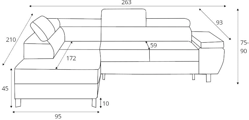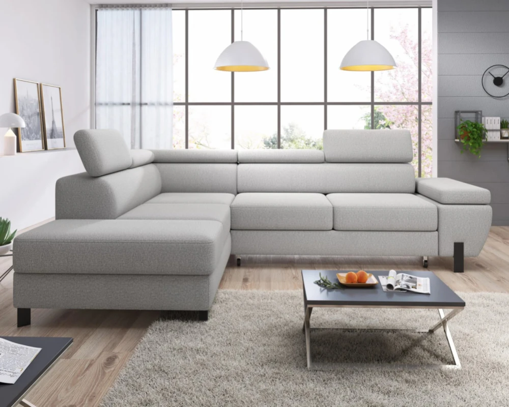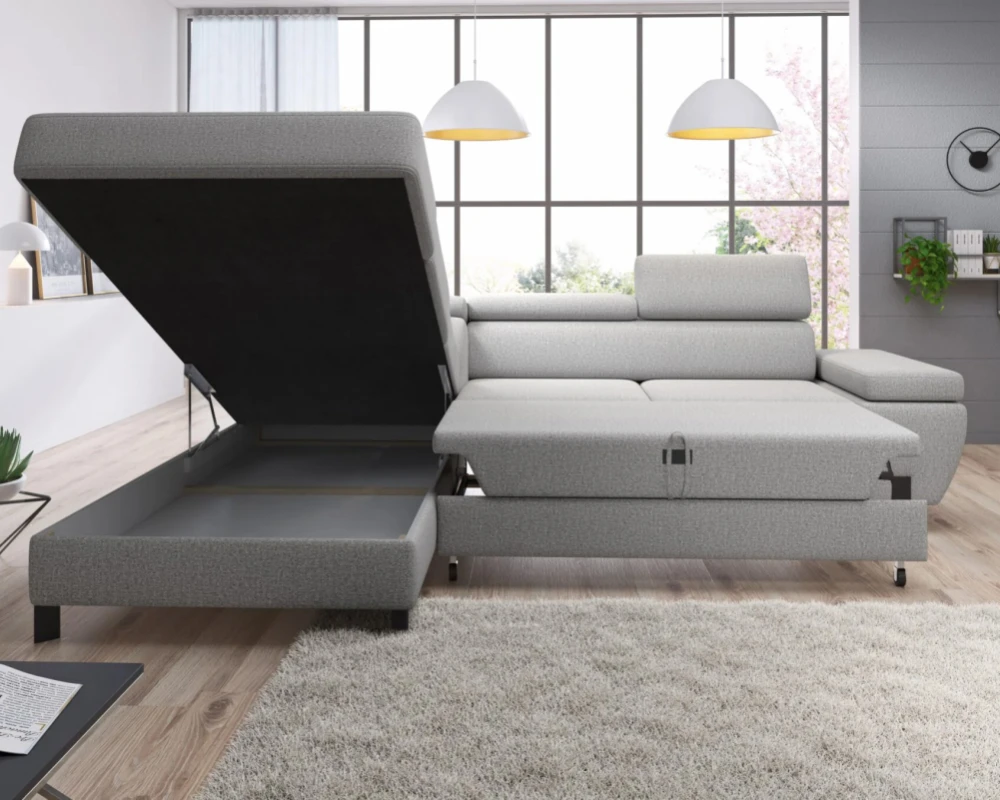 Угловые диваны Molina от производителя Wersal отличаются модернистской формой, прочностью и красивой отделкой. Прочная конструкция на элегантных хромированных ножках оснащена функцией регулировки высоты подголовника, позволяющей настраивать высоту каждой спинки. Все подлокотники также подвижны, что еще больше повышает комфорт. Функциональный угловой диван Molina раскладывается в спальное положение (функция «сон/прогулка»), а его пуфик имеет вместительное отделение для хранения постельного белья. Размеры отделения для мини-версии: 180x65x16 см, для версии L: 197x83x16 см, а для версии XL: 197x83x16 см (слева) и 180x65x16 см (справа). Наполнитель сиденья: волновые пружины типа А, пенополиуретан N30 и эластичный ремень. Наполнитель спинки: пенополиуретан T1818. Металлические ножки высотой 10 см. Угловой диван доступен в левостороннем и правостороннем вариантах. Модель выпускается в версиях Mini, L и XL.