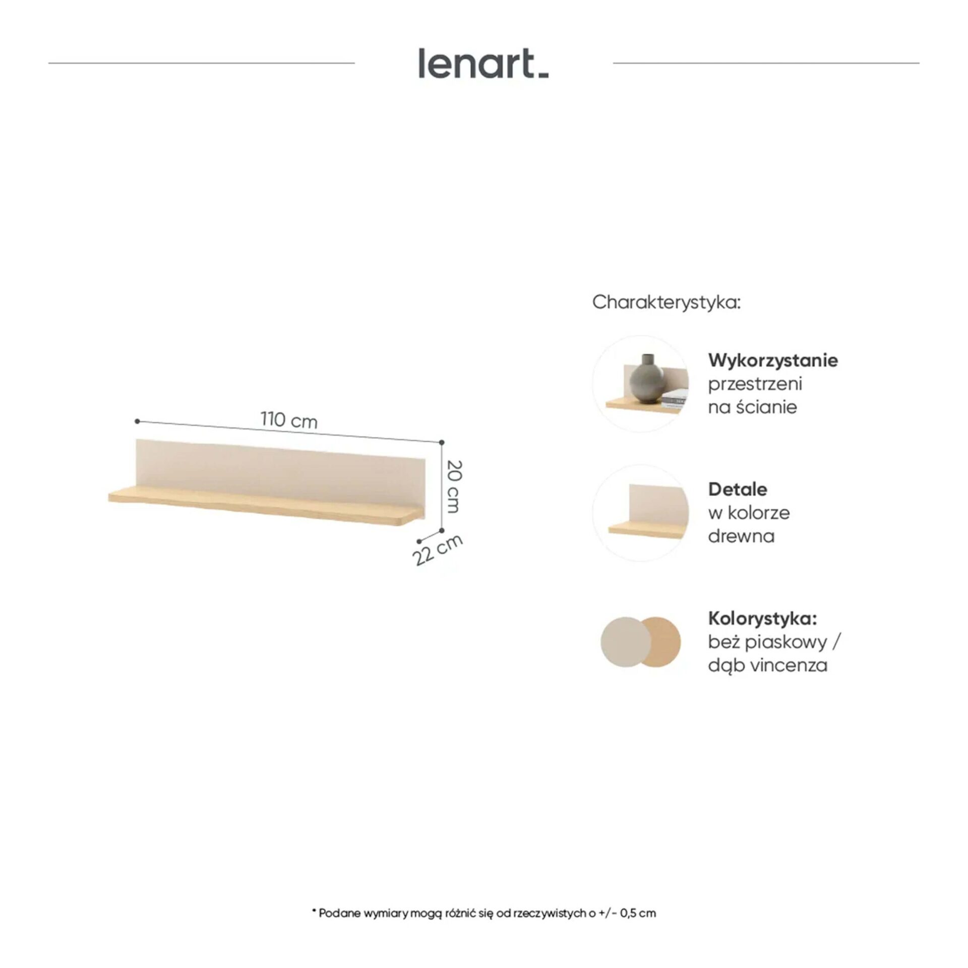 Максимальная грузоподъемность полки составляет приблизительно 5 кг, что позволяет безопасно размещать на ней книги или легкие декоративные предметы. Размеры полки составляют приблизительно 110 см в ширину, 20 см в высоту и 22 см в глубину, что делает ее достаточно широкой, но не слишком высокой, поэтому она подходит для настенного крепления над столом или кроватью.