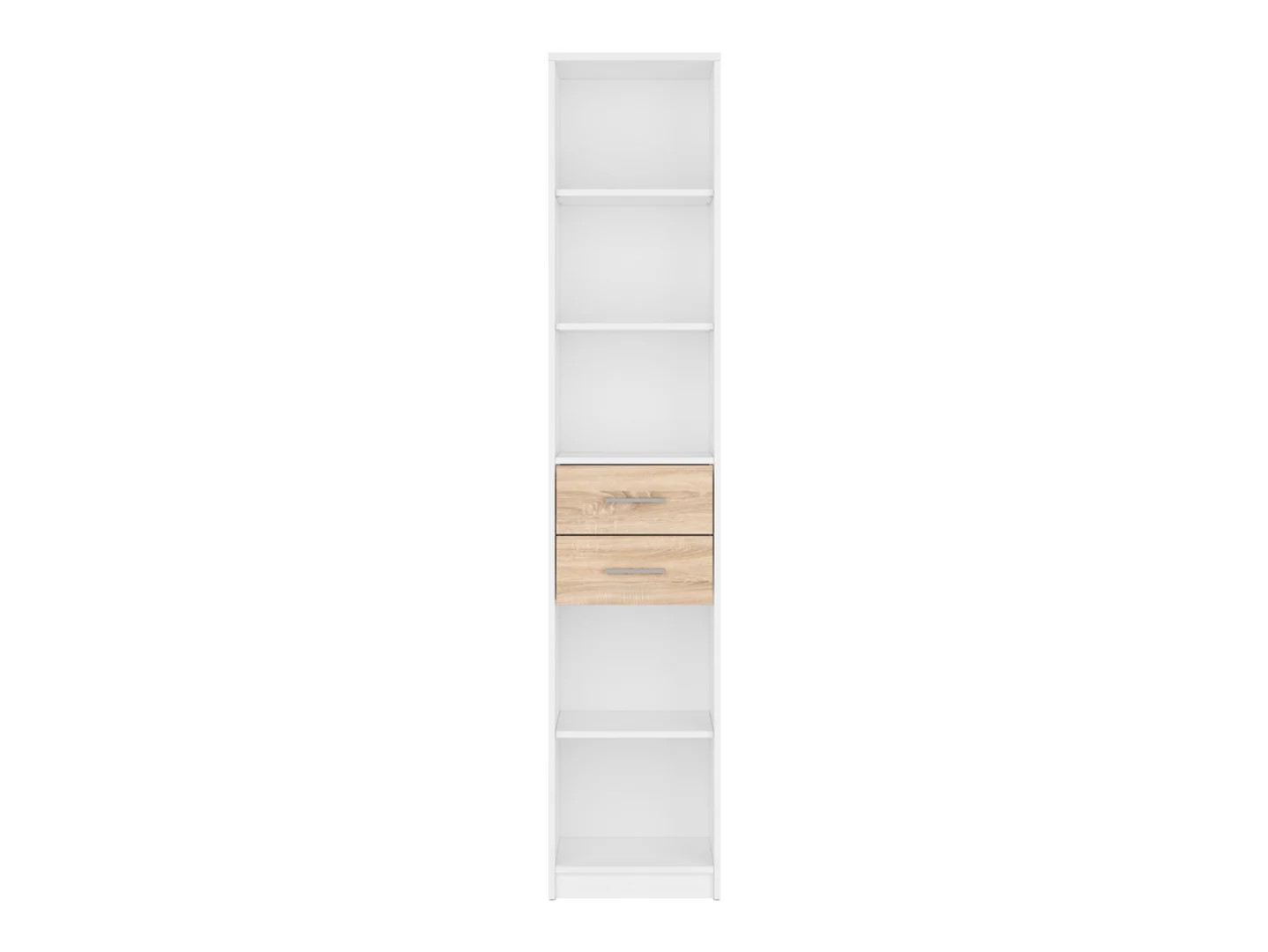 Atvira knygų lentyna su dviem stalčiais NEPO PLUS 40 cm balta/sonoma ąžuolas
