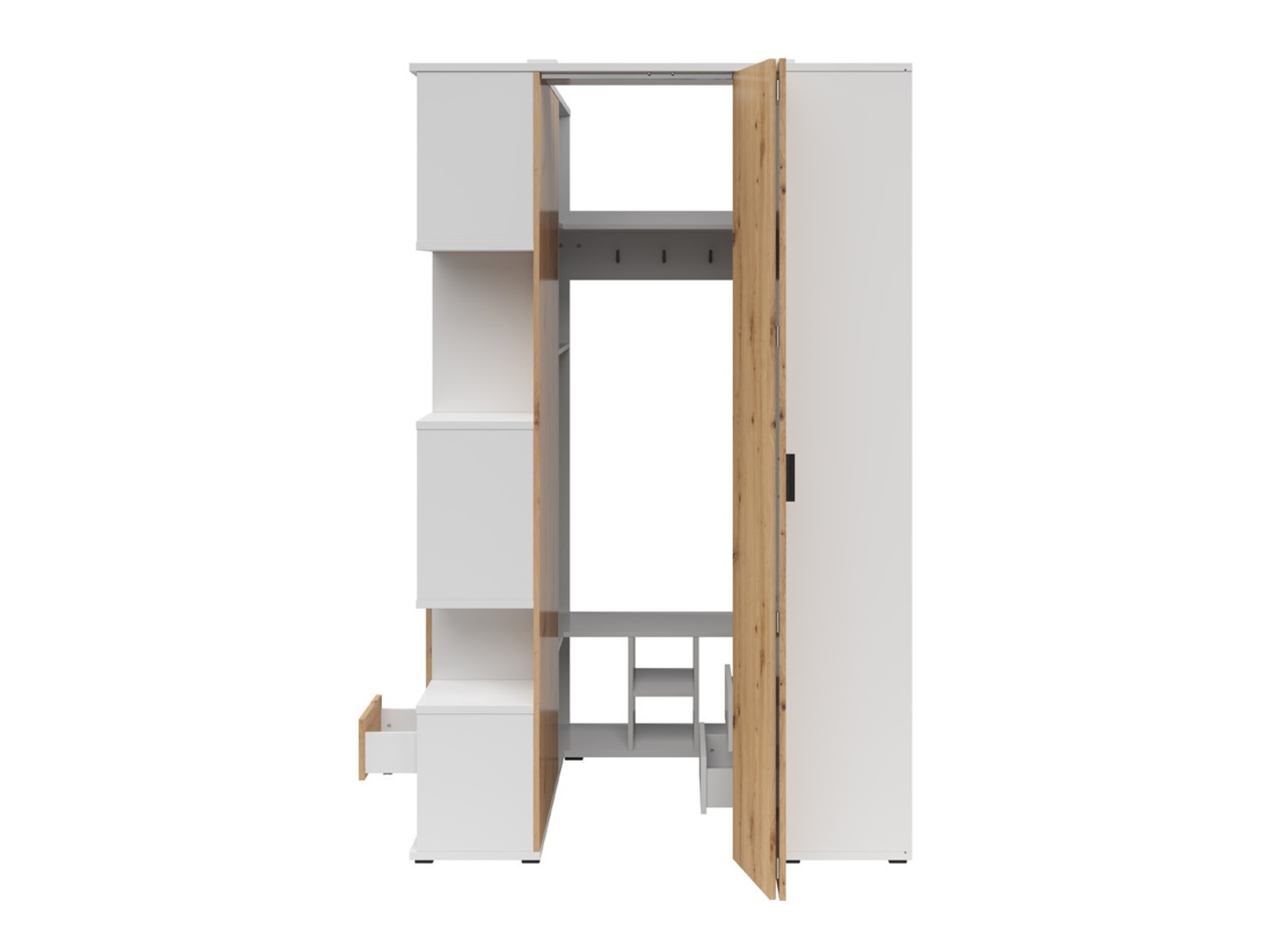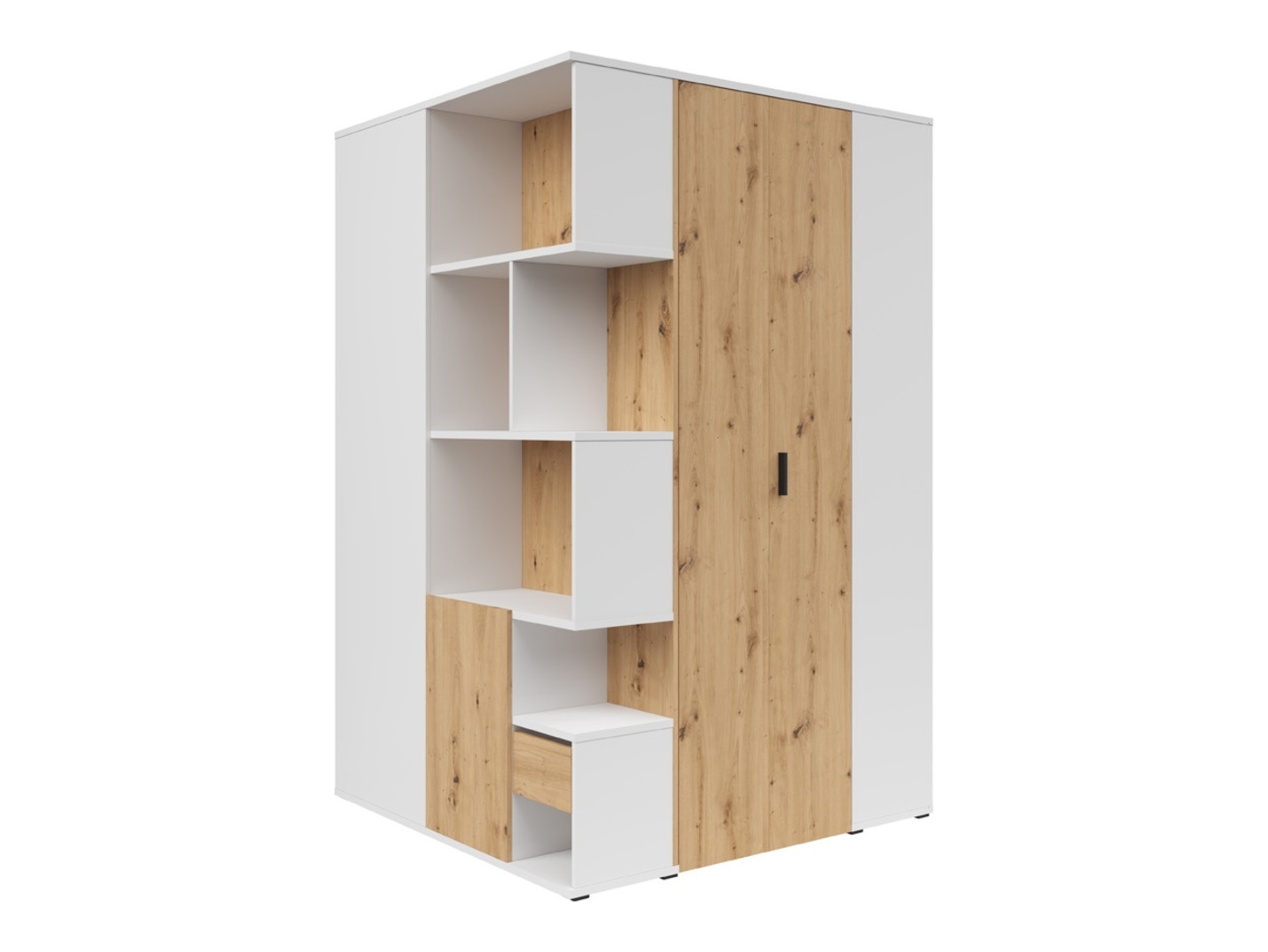 Шкаф Homeland Shelf – функциональный и современный гардероб. Коллекция Homeland предлагает мебель, сочетающую функциональность и эстетику. Красивая текстура дерева в сочетании с универсальным белым цветом создает уютный и организованный интерьер. Размеры и функциональность: Ширина: 136 см, Глубина: 135 см, Высота: 216 см. Шкаф Homeland Shelf – это впечатляющий гардероб, который обеспечивает место для всех ваших вещей, помогая вам поддерживать порядок. Он оснащен: штангой для вешалок: идеально подходит для хранения одежды на вешалках; ящиками с доводчиками: удобны для хранения мелких предметов; множеством полок: обеспечивая место для различных вещей. Внешняя часть шкафа имеет оригинальные полки для демонстрации, которые можно использовать для книг, фотографий, цветов и других украшений, добавляя индивидуальности помещению. Дизайн и материалы: Цвета: теплый оттенок дуба ручной работы в сочетании с классическим белым. Материалы: фасады и корпуса изготовлены из высококачественной ламинированной плиты, обеспечивающей долговечность и легкость в уходе. Преимущества шкафа: Эстетика: сочетание дерева и белого цвета привносит уют и элегантность в интерьер. Практичность: благодаря продуманному расположению направляющих, полок и ящиков, все вещи найдут свое место. Универсальность: идеально подходит для спальни, квартиры-студии или многофункциональных помещений. Варианты: доступны в правостороннем и левостороннем исполнении, что позволяет адаптировать полку к различным планировкам помещений. Применение: Полка Homeland — отличный выбор для различных типов интерьеров: Спальня: создает функциональное и стильное пространство. Для хранения одежды. Квартира-студия: помогает организовать небольшие пространства, сочетая функции шкафа и декоративной полки. Многофункциональные помещения: сохраняет эстетику интерьера, предлагая при этом достаточно места для хранения. Резюме: Стеллаж Homeland — это функциональный и современный шкаф, который поможет организовать пространство и создать уютную атмосферу. Благодаря сочетанию теплого дуба ручной работы и классического белого цвета, этот предмет мебели дополнит различные варианты дизайна интерьера. Высококачественные материалы и продуманный дизайн делают его практичным выбором, который также выполняет декоративную функцию.