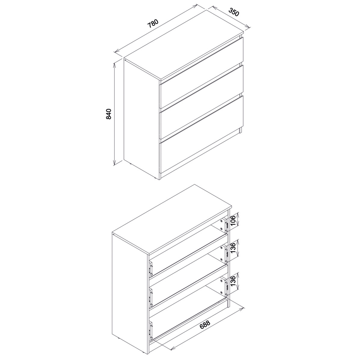 Ширина 78 см, глубина 35 см, высота 84 см, вес изделия с упаковкой 31,72 кг. Код/символ производителя RM02. Название коллекции REMI. Количество упаковок: 1. Стиль: Модерн. Комплектация: Инструкция по сборке / принадлежности для сборки. Сборка: Самостоятельная сборка. Материал столешницы / тип / толщина: ламинированная ДСП 16 мм. Материал корпуса / тип / толщина: ламинированная ДСП 16 мм. Материал передней панели / тип / толщина: ламинированная ДСП 16 мм. Передняя ручка / тип / цвет: фрезерованная. Направляющие ящиков: шарикоподшипники. Количество ящиков: 3.