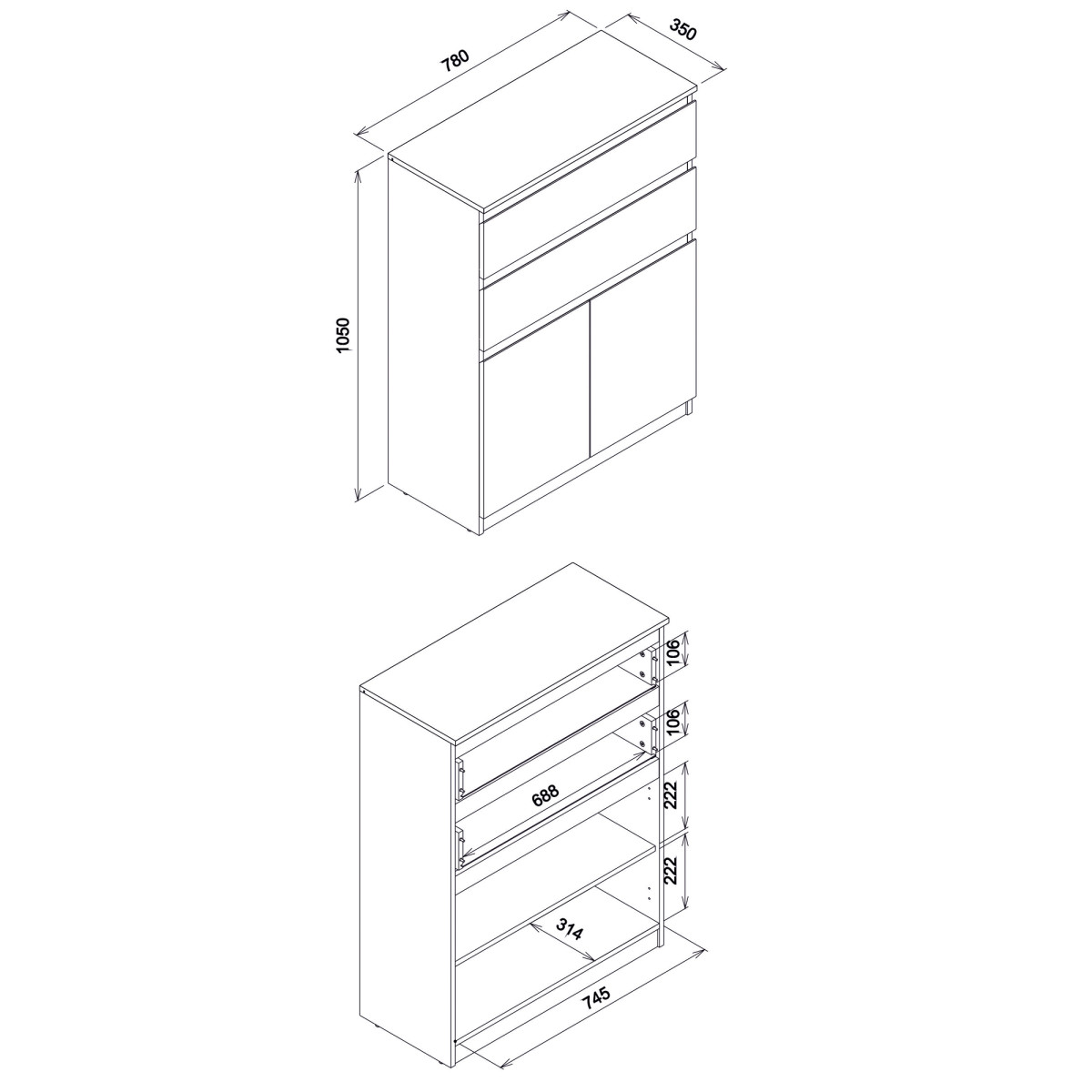 Ширина 78 см, глубина 35 см, высота 105 см, вес изделия с упаковкой 23 г. Код/символ производителя RM05, название коллекции REMI, количество упаковок 2, стиль: современный, комплектация: инструкция по сборке/комплектующие для сборки, сборка: для самостоятельной сборки, материал столешницы/тип/толщина: ламинированная ДСП 16 мм, материал/тип/толщина корпуса: ламинированная ДСП 16 мм, количество полок: 1, материал/тип/толщина передней панели: ламинированная ДСП 16 мм, передняя ручка/тип/цвет: фрезерованная, направляющие ящиков: шарикоподшипники, ножка/тип/цвет: цоколь, количество ящиков: 2