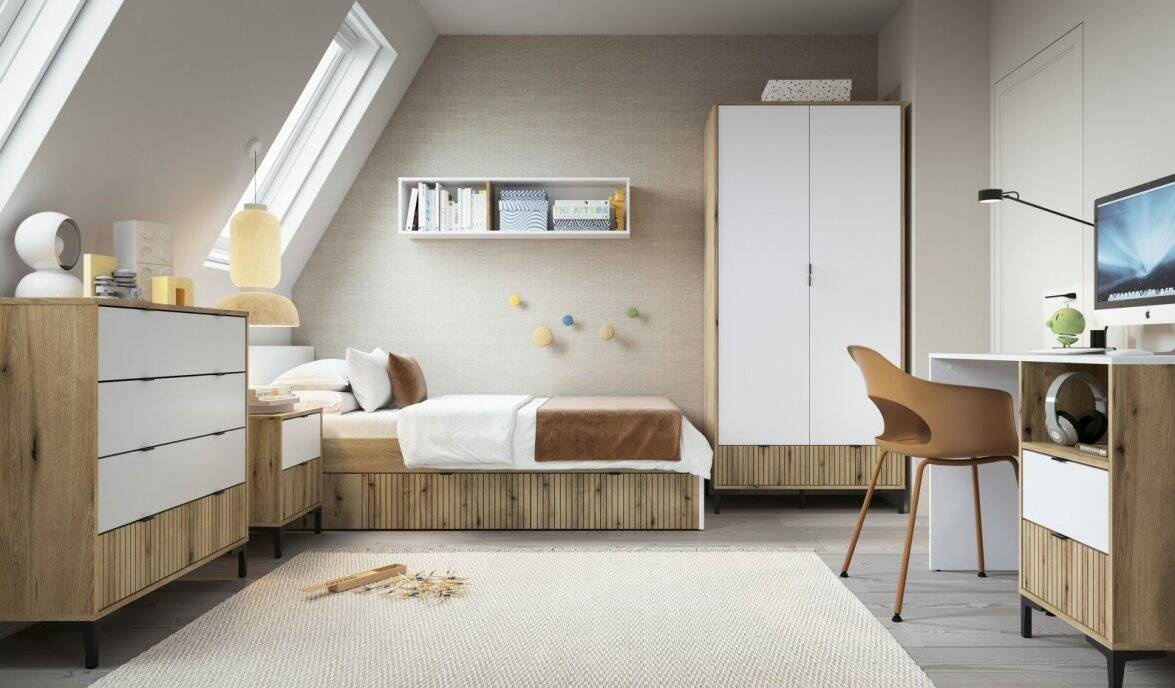 Откройте для себя очарование современной спальни с кроватью Ricko RIKZ02 – 120 см, цвет белый/дуб, Coast Evoke, идеальным выбором для взыскательных ценителей комфорта и стиля. Побалуйте себя роскошью каждый день с этим элегантно спроектированным предметом мебели, сочетающим в себе эстетику и функциональность. Размеры кровати Ricko RIKZ02: ширина 125,4 см, высота 80,5 см и длина 205 см. Это идеальное решение для молодежи и взрослых, ищущих больше места для отдыха, чем стандартная односпальная кровать. Широкая цветовая гамма, сочетающая натуральные оттенки дуба Coast Evoke с чистым белым, делает кровать идеальным дополнением к различным стилям интерьера – от скандинавского минимализма до строгого стиля лофт. Изготовленная из прочной ламинированной ДСП, она устойчива к ежедневному использованию и легко чистится. Изголовье и боковые части кровати выполнены из ламинированной ДСП, что обеспечивает структурную стабильность и эстетическую привлекательность на долгие годы.