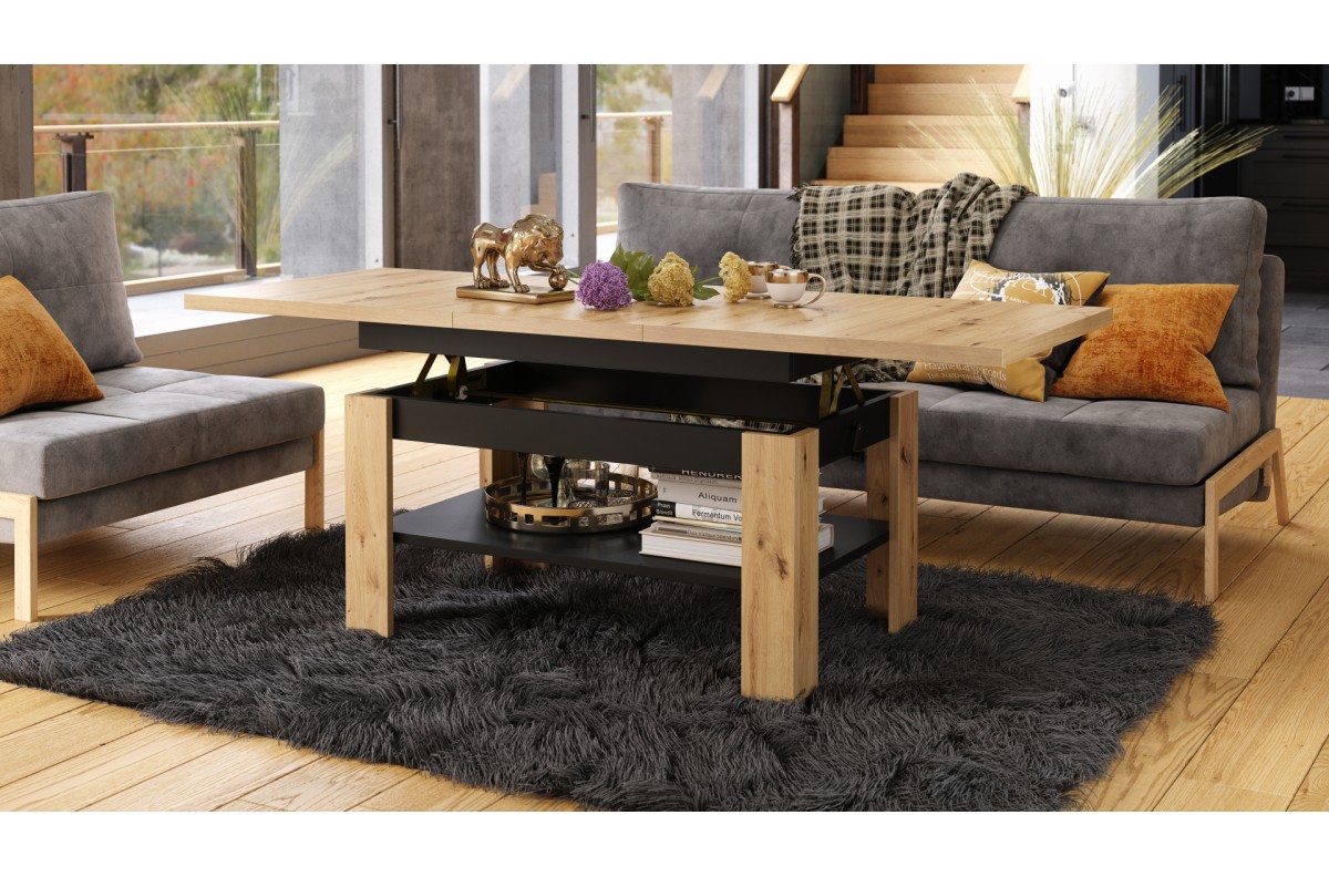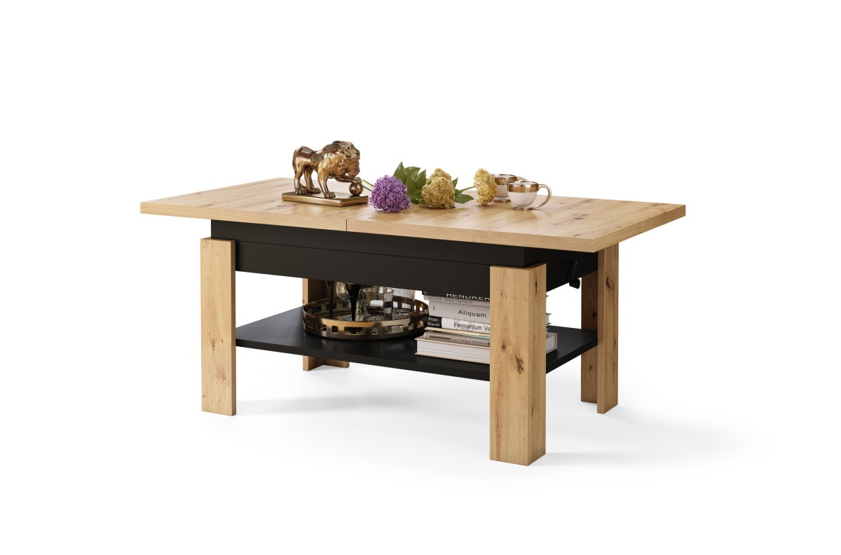 RIO Artisan ąžuolo/matinės juodos spalvos – sulankstomas, pakeliamas kavos staliukas su lentyna