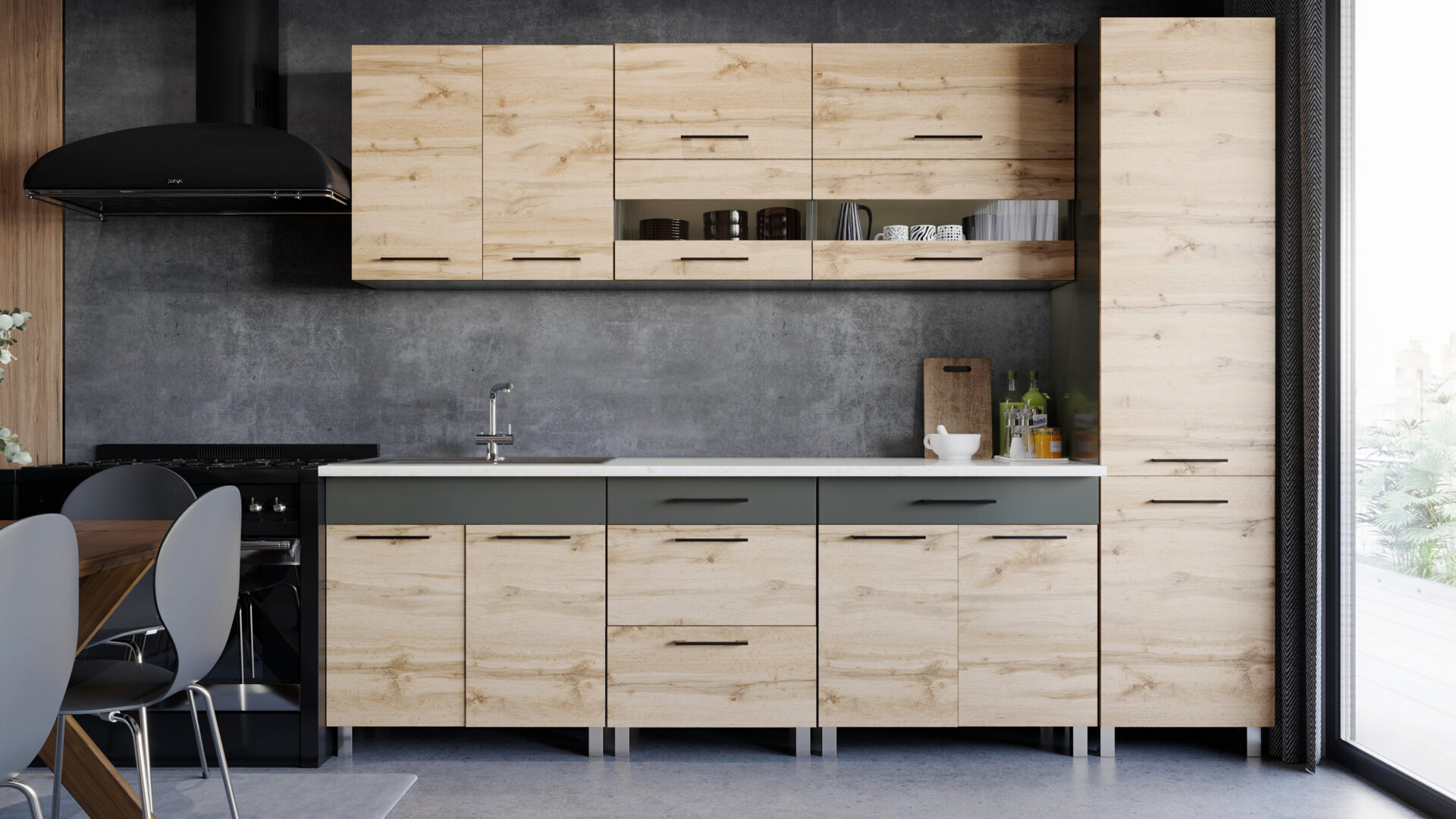 Кухня на визуализации выполнена в следующих цветах: корпус: антрацит / фасад: Вотан – ящики: графит