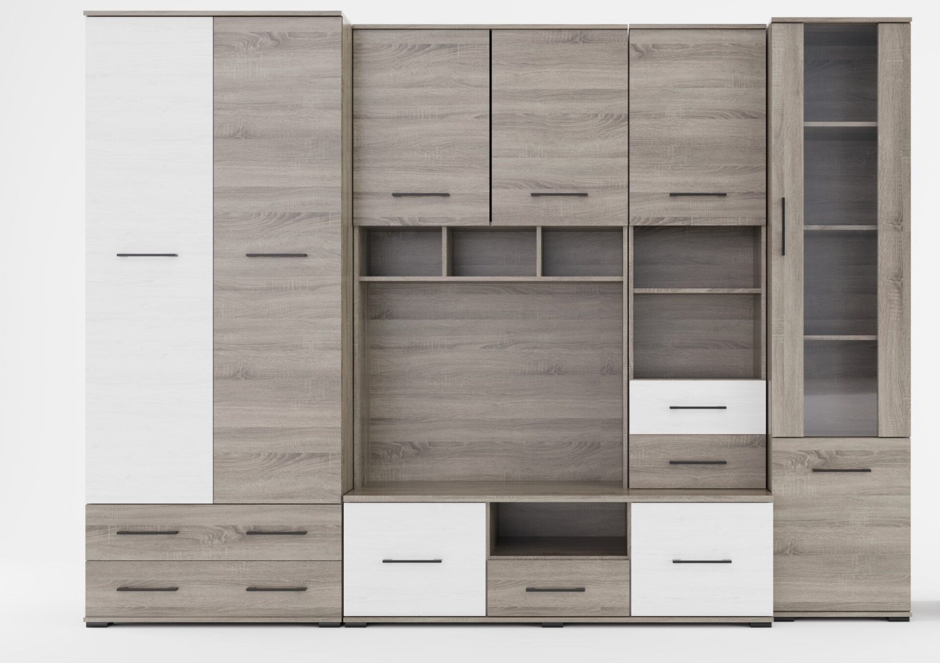 Комплект ROXI II B — идеальный выбор для тех, кто ценит классический стиль во всем. Настенный модуль оснащен множеством практичных отделений для хранения, которые помогут вам поддерживать порядок, а благодаря открытым полкам со стеклянными дверцами вы сможете подчеркнуть свой неповторимый стиль стильными аксессуарами. Мебель просторная и доступна в различных цветовых решениях. Размеры: