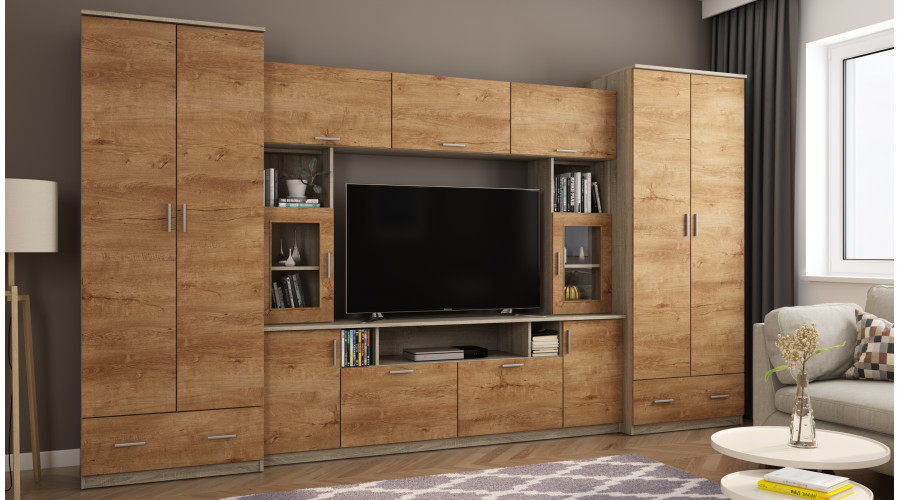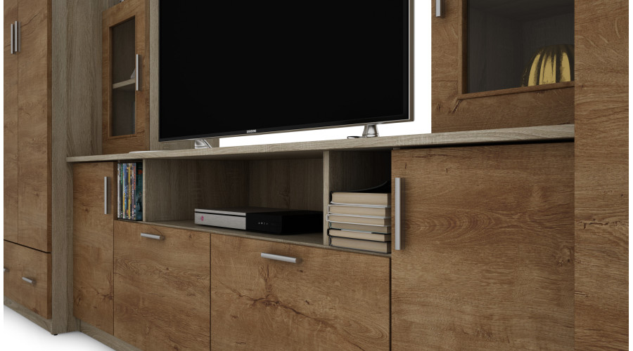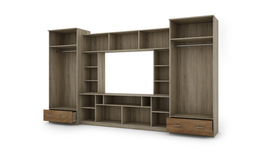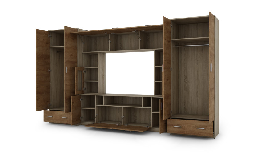 В комплект входят два больших шкафа для хранения одежды и крупных предметов. Их дополняют запирающиеся шкафы и полки, облегчающие организацию хранения мелких вещей и аксессуаров. Центральное отделение для телевизора, а также место для мультимедийной техники органично вписаны в общий дизайн.