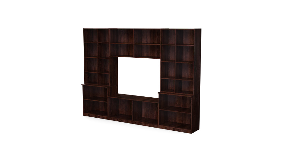 Центральная полка для телевизора спроектирована таким образом, чтобы удобно разместить экран и электронные устройства, не нарушая общую эстетику. Продуманное расположение шкафов и ящиков позволяет функционально использовать пространство: от хранения документов и мультимедийных аксессуаров до текстиля и мелких предметов интерьера. Это помогает поддерживать порядок и создает гармоничную, организованную зону отдыха.