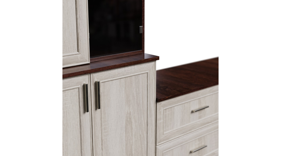 Сочетание светлых и темных оттенков Sonoma хорошо вписывается в современные, скандинавские и классические интерьеры. Светлые элементы визуально осветляют пространство, а темные акценты придают всей конструкции глубину и устойчивость. Это решение хорошо смотрится как в больших помещениях, так и в стандартных гостиных. Настенная секция STILO изготовлена из прочной ламинированной плиты толщиной 18 мм, обеспечивающей стабильность и устойчивость к повседневному использованию. Края с ПВХ-покрытием защищают конструкцию от влаги и механических повреждений, а задняя стенка из HDF дополнительно укрепляет всю конструкцию. Вы можете выбрать стандартную или премиум-фурнитуру.