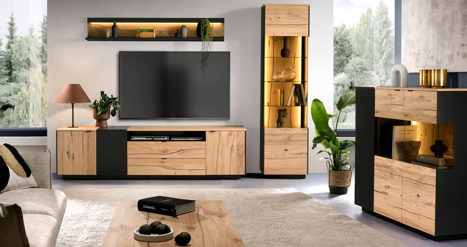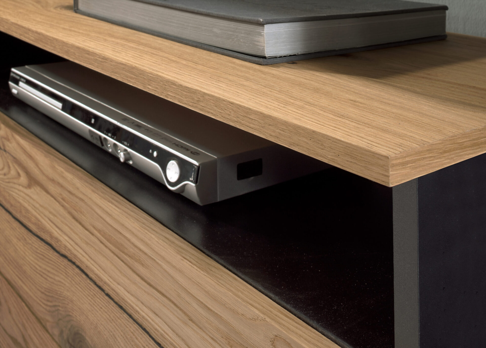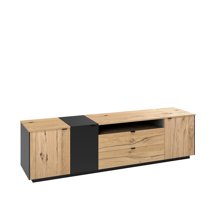 Подставка под телевизор ROSTOCK RO-RTV/DI. В этой коллекции почерневшие трещины, бороздки и ветви натурального дуба в сочетании с матовым черным покрытием выглядят еще более выразительно и идеально сочетаются друг с другом. Выделенная и почерневшая структура дубовых элементов с черными трещинами и бороздками придает коллекции выразительность и разнообразит тонкий цветовой контраст. Небольшие черные металлические ручки являются незаметным элементом коллекции.