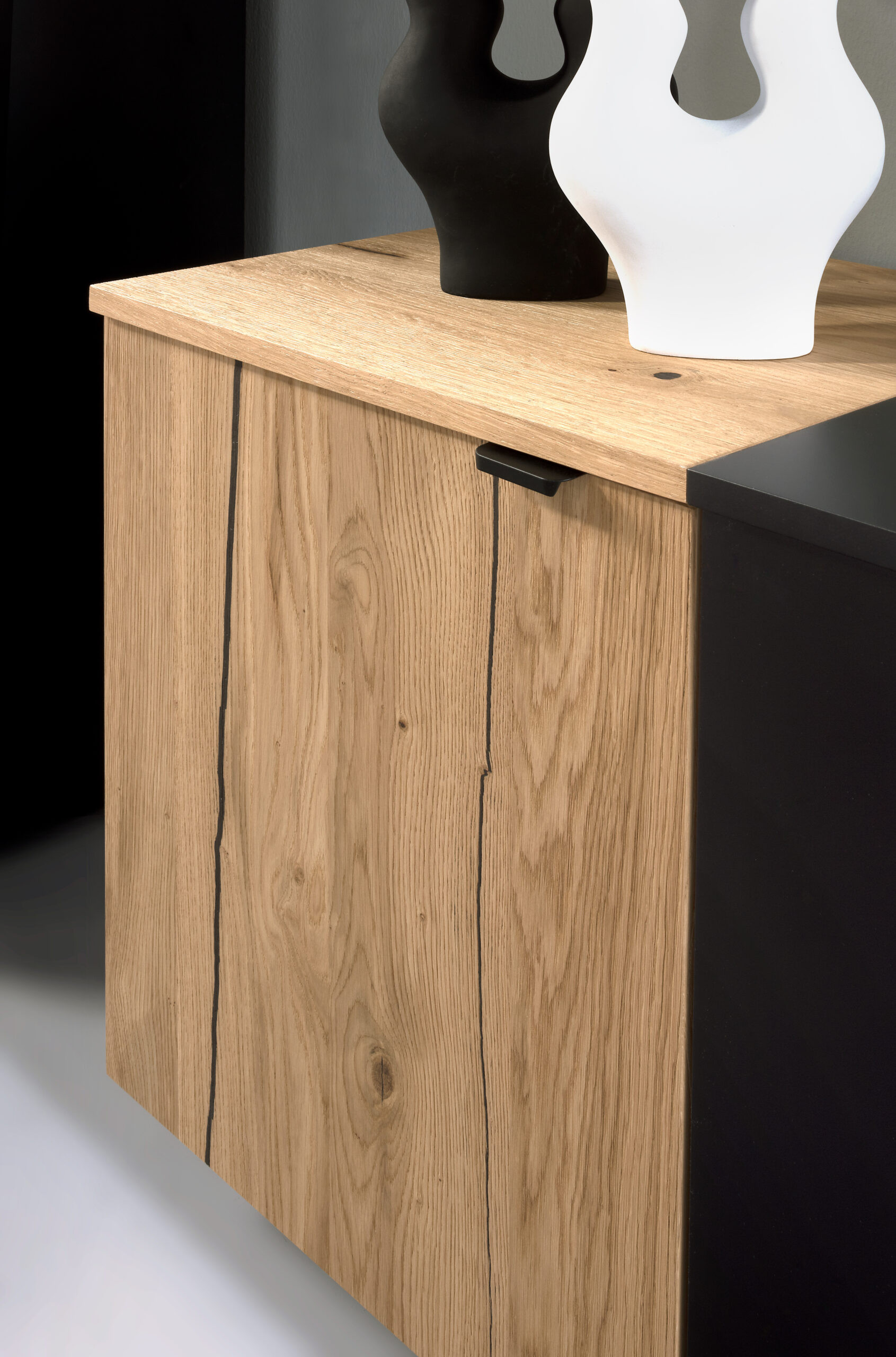 Застекленные боковые стенки витрин и светодиодная подсветка еще красивее подчеркивают и без того впечатляющее очарование текстуры дубовой древесины. Материал фасада: натуральный дубовый шпон / ПВХ-пленка.