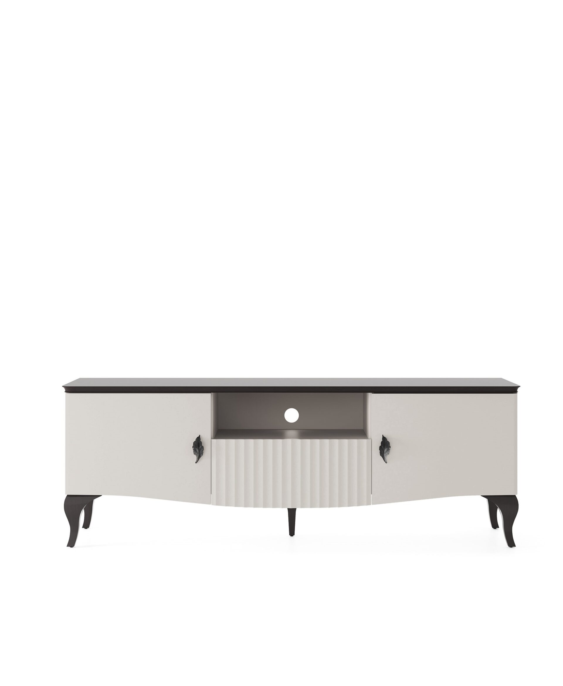 Тумба под телевизор MADERA MD-RTV/M. Эксклюзивная коллекция в матовом цвете «саванна» с резными вставками на фасаде и контрастной черной рамкой создает современный характер. Благодаря светодиодной подсветке вертикальные тени на задней стенке тумбы тонко повторяют рифленые вставки на фасаде. Завершающий штрих – ручки в форме листьев, которые также добавляют очарования. Фасад: фрезерованный, окрашенный МДФ.