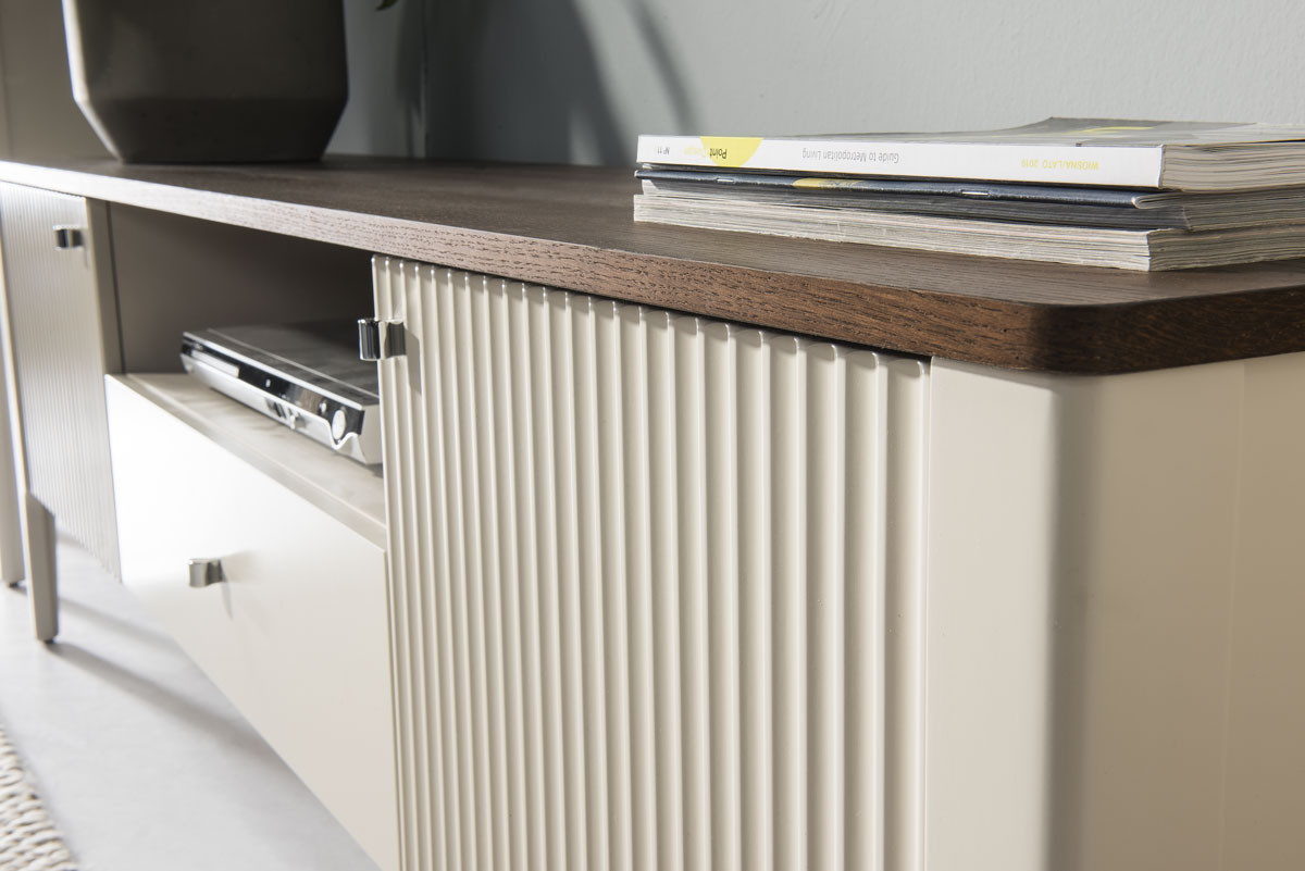 Тумба под телевизор WENECJA WE-RTVI из эксклюзивной коллекции с 3D-фасадом и уютной отделкой под шоколадный дуб создает современный образ. Это воплощение современной эстетики, пронизанное ностальгией по прошлому. Темная задняя стенка из шоколадного дуба, дымчатое стекло и ненавязчивая подсветка полок придают тумбе таинственный шарм.
