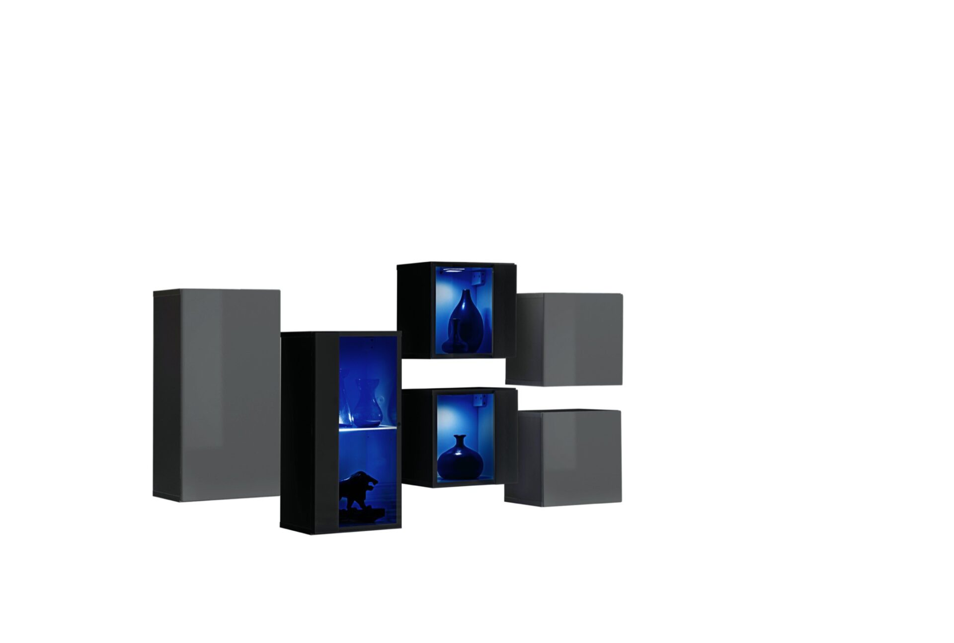 Настенный шкаф: дверцы, за которыми находится одна стандартная полка (2 отделения). Настенная витрина: частично застекленные дверцы, за которыми находится отделение со стеклянной полкой, подсвеченной синей светодиодной подсветкой. 2 настенных витрины: частично застекленные дверцы, за которыми находится отделение, подсвеченное синей светодиодной подсветкой. 2 настенных шкафа: дверцы, за которыми находится одно отделение. Передние панели открываются с помощью механизма «нажать-защелкнуть».