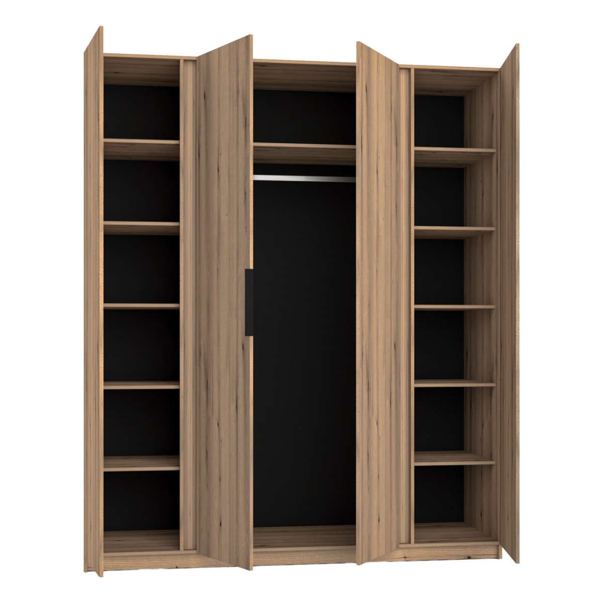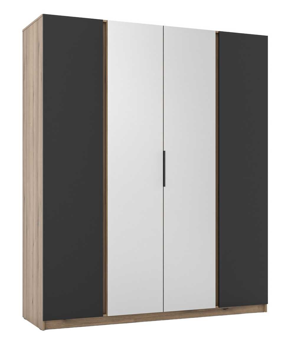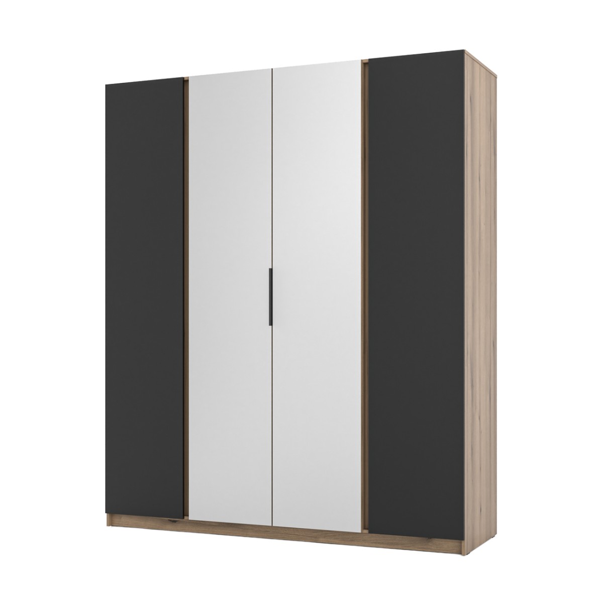 Четырехдверный шкаф изготовлен из ламинированной плиты и оснащен двумя зеркалами, полками и вешалкой для одежды. Параметры: