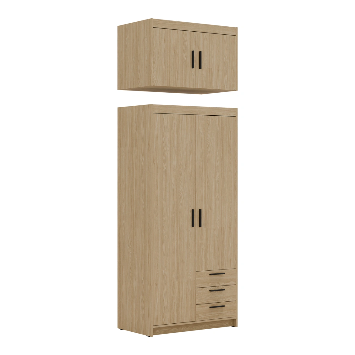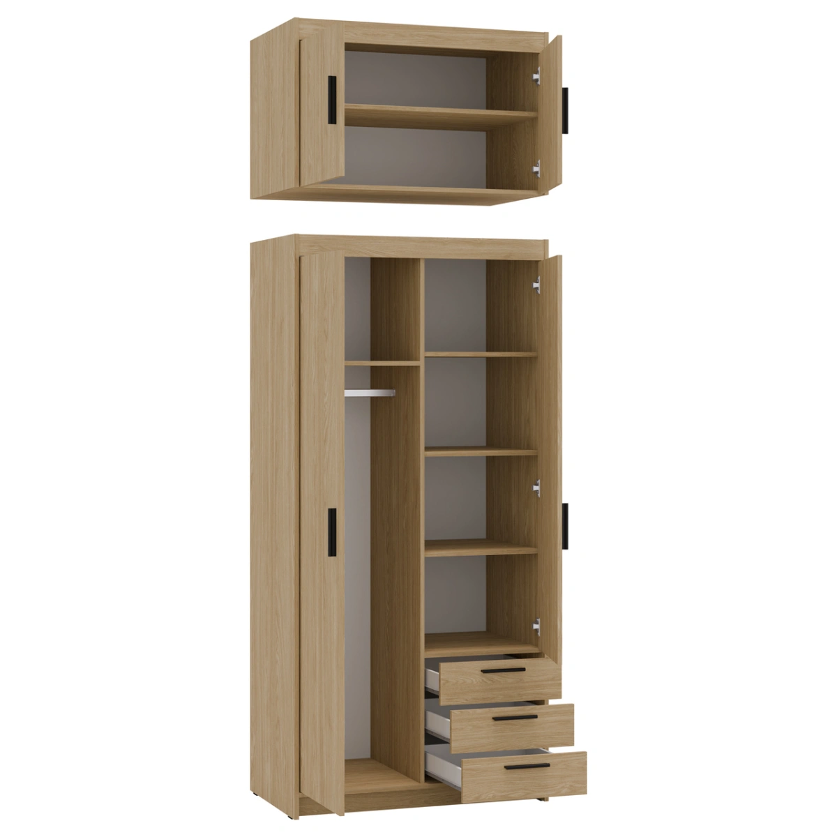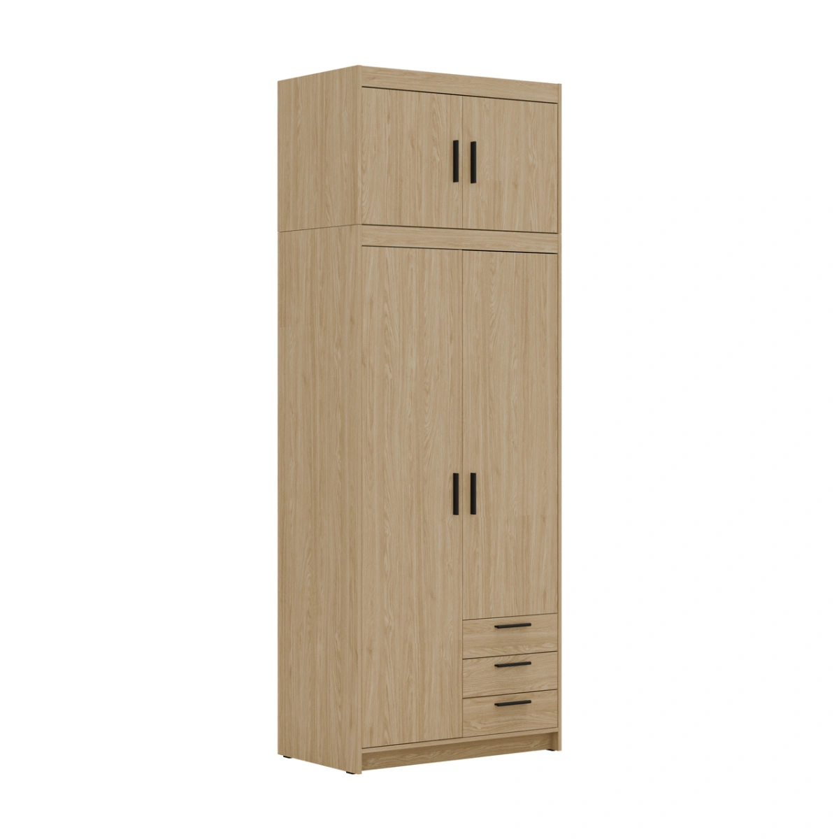 Двухдверный шкаф изготовлен из ламинированной плиты и имеет полку с вешалкой для одежды под ней, дополнительные полки и три выдвижных ящика.