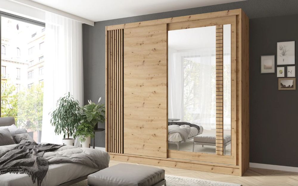 Двухуровневый шкаф Artiz 200 см с ламелями – имеет полку с одной стороны и штангу для вешалок снизу, полки с другой стороны и зеркало спереди.