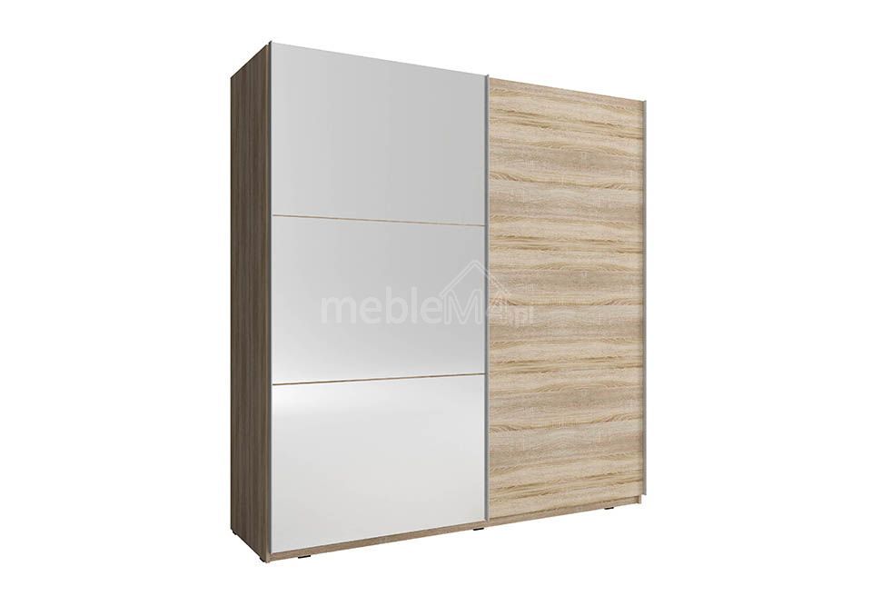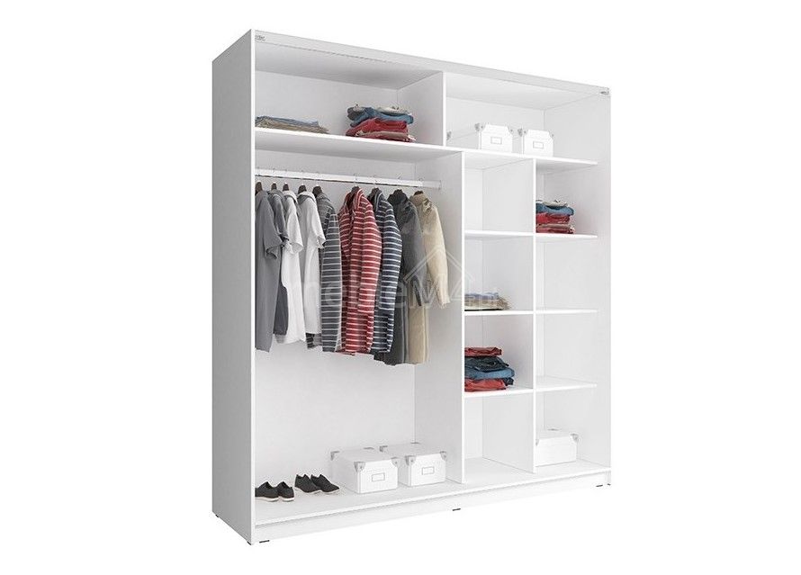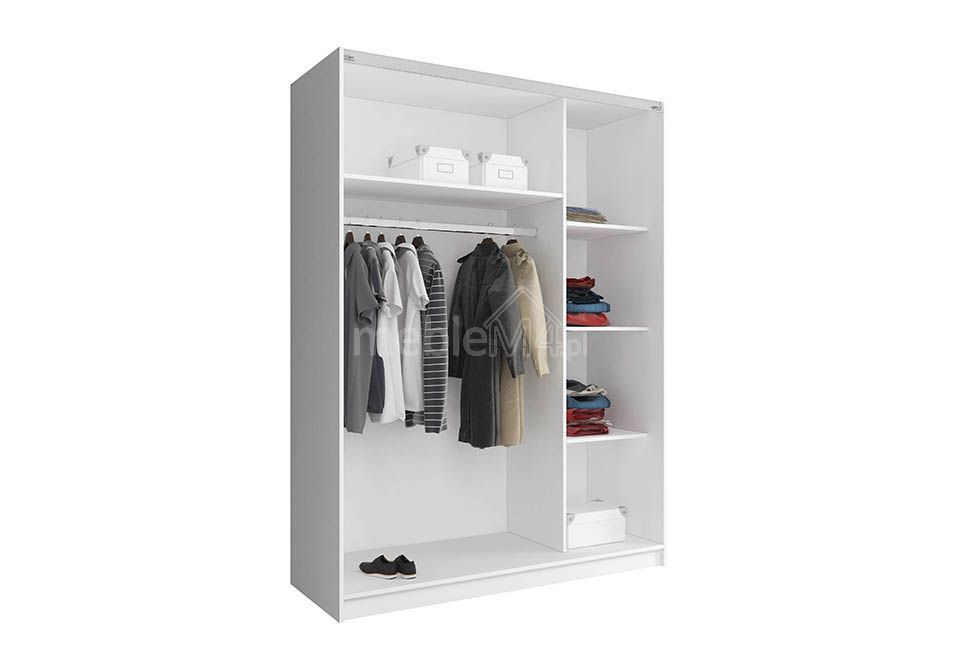 Шкаф MIKA II изготовлен из высококачественной ламинированной плиты толщиной 16 мм с кромками из АБС-пластика. Основание выполнено из МДФ. Он оснащен вешалкой для одежды и многочисленными полками – внутреннее устройство показано на фотографии. Этот шкаф идеально подходит для хранения одежды.