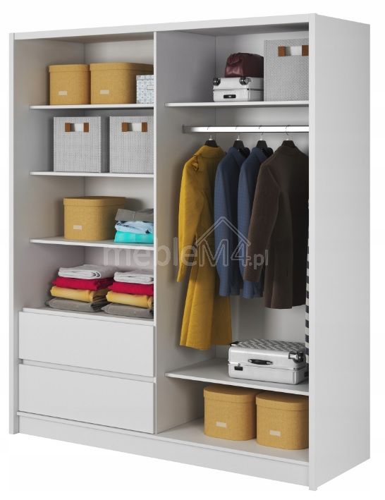 Включает в себя вешалку для одежды, многочисленные полки и выдвижные ящики – внутреннее устройство показано на фотографии.