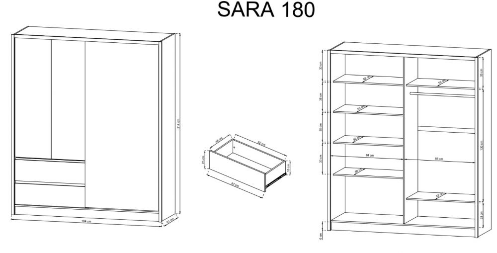 Шкаф SARA 180 изготовлен из высококачественной ламинированной плиты толщиной 16 мм с повышенной устойчивостью к царапинам.