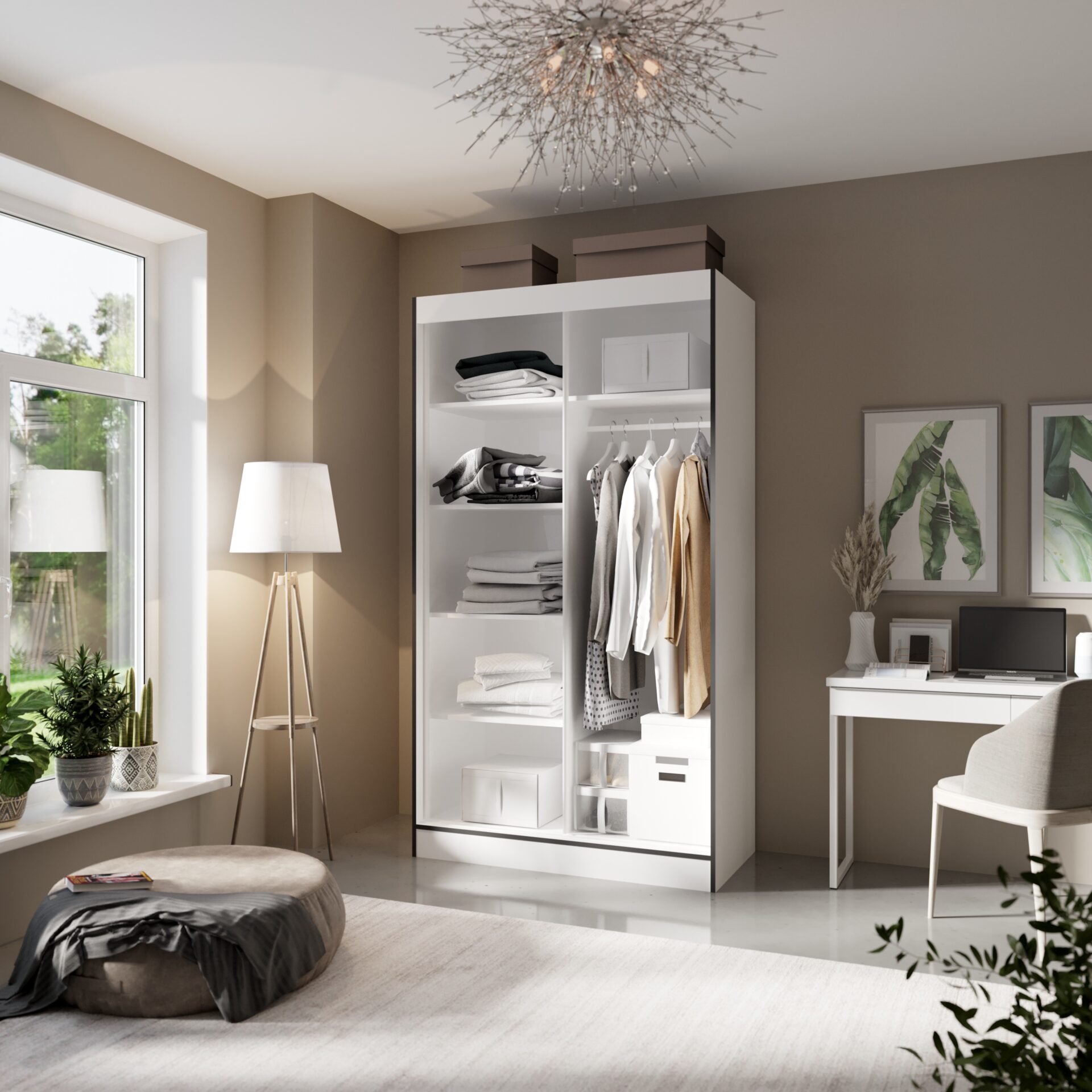 Раздвижной шкаф OSGAR — идеальный выбор для гостиной, спальни или прихожей. Он обеспечивает удобное хранение вещей. Оснащенный штангой для вешалок и просторными полками, он позволяет легко организовать пространство в комнате. Простой, но функциональный. Мы рекомендуем вам ознакомиться с тремя доступными размерами шкафа OSGAR.