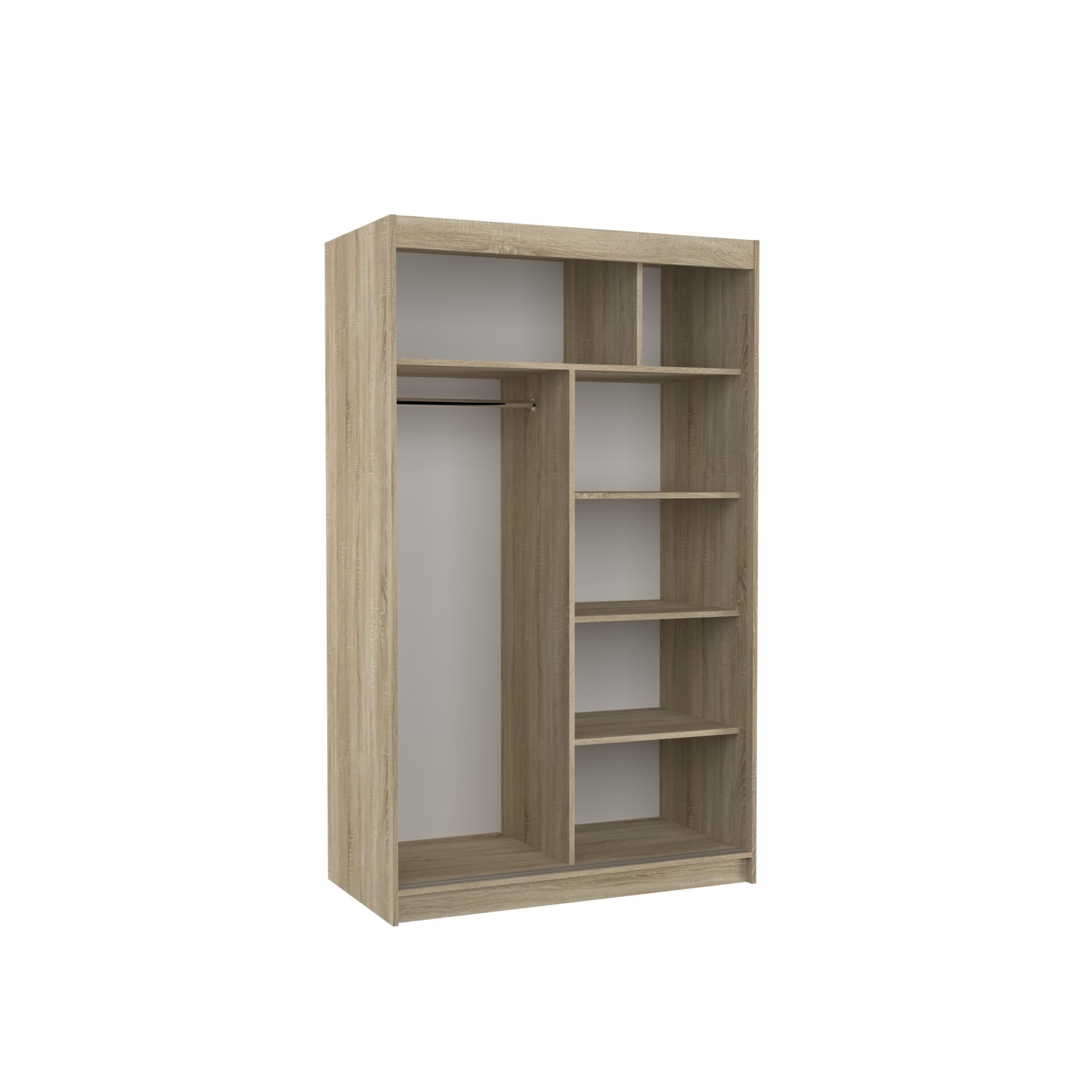 Раздвижной шкаф GENUA с зеркалом — идеальное решение для организации пространства. Он оснащен просторными полками и штангой для одежды, платьев, костюмов, верхней одежды и рубашек. Зеркало на передней панели визуально расширяет пространство. Благодаря раздвижной конструкции вам не нужно создавать дополнительное пространство для открытия дверей, что делает его идеальным решением для небольшой комнаты или узкого коридора. Дополнительным преимуществом является возможность приобретения привлекательной светодиодной подсветки, которая добавит очарования как шкафу, так и помещению.