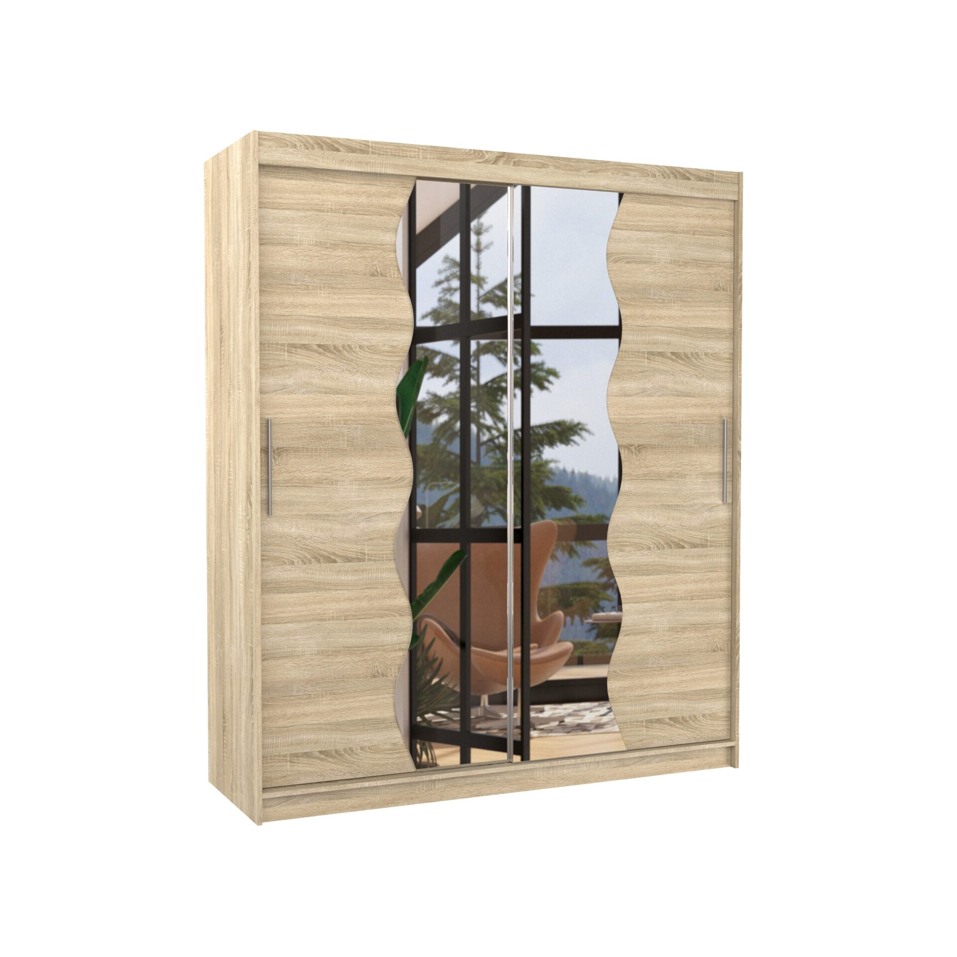 Раздвижной шкаф KANSAS с зеркалом — идеальное решение для организации пространства. Он оснащен просторными полками и штангой для вешалок, на которых можно разместить платья, костюмы, верхнюю одежду или рубашки. Зеркала, прикрепленные к передней части, визуально увеличивают пространство. Благодаря раздвижной конструкции вам не нужно создавать дополнительное пространство для открытия дверей, что делает его идеальным решением для небольшой комнаты или узкого коридора.