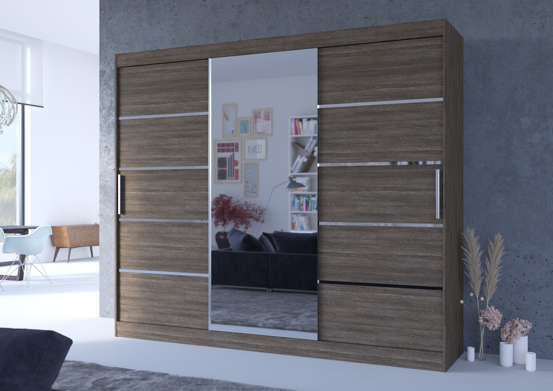 Раздвижной шкаф SALTO — идеальное решение для организации пространства. Он оснащен просторными полками и штангой для вешалок, на которых можно хранить платья, костюмы, верхнюю одежду и рубашки. Передняя панель украшена зеркалом и характерными серебристыми горизонтальными полосами, придающими изделию неповторимый стиль. Благодаря раздвижной конструкции вам не нужно создавать дополнительное пространство для открытия дверей, что делает его идеальным решением для небольшой комнаты или узкого коридора.