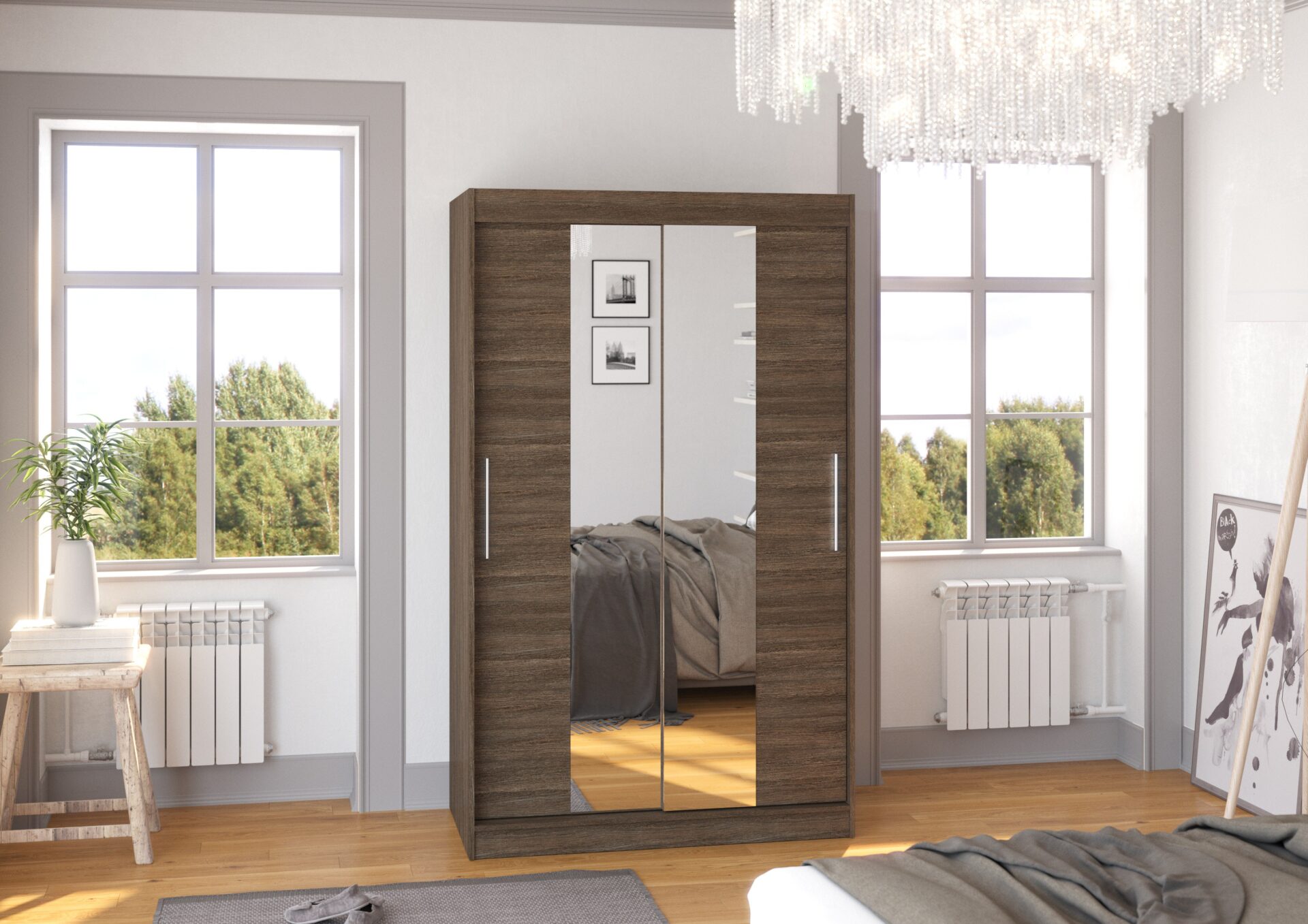 Раздвижной шкаф SANTOS с зеркалом — идеальное решение для организации пространства. Он оснащен просторными полками и штангой для одежды, платьев, костюмов, верхней одежды и рубашек. Вертикальные зеркала, прикрепленные к передней части, визуально расширяют пространство и добавляют стиля. Благодаря раздвижной конструкции вам не нужно создавать дополнительное пространство для открытия дверей, что делает его идеальным решением для небольшой комнаты или узкого коридора.