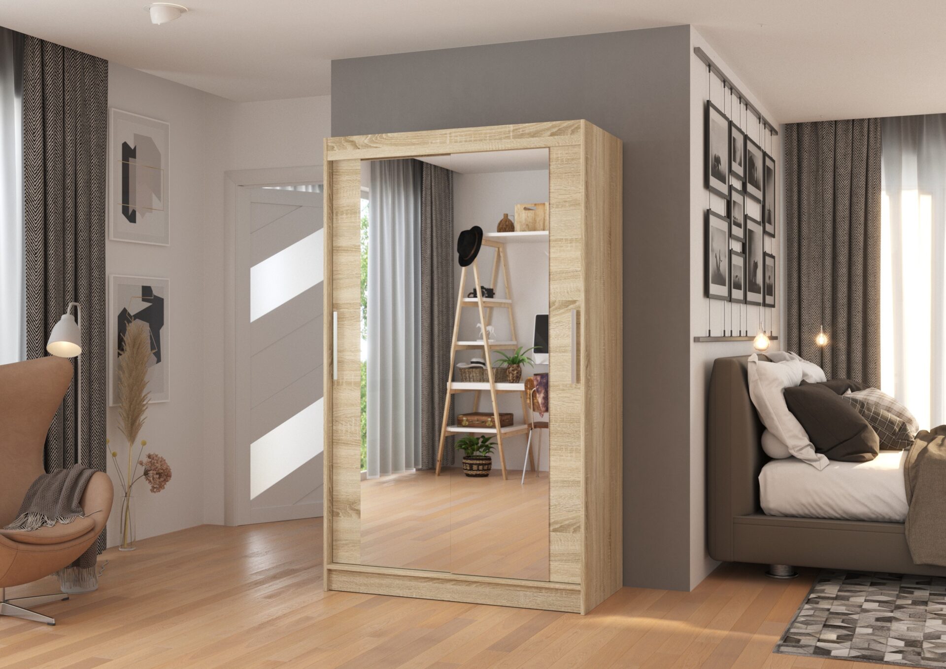 Раздвижной шкаф TIBAGO с зеркалом — идеальное решение для организации пространства. Он оснащен просторными полками и штангой для вешалок, на которых можно разместить платья, костюмы, верхнюю одежду или рубашки. Зеркала, прикрепленные к передней части, визуально расширяют пространство и добавляют стильный акцент. Благодаря раздвижной конструкции вам не нужно создавать дополнительное пространство для открытия дверей, что делает его идеальным решением для небольшой комнаты или узкого коридора.