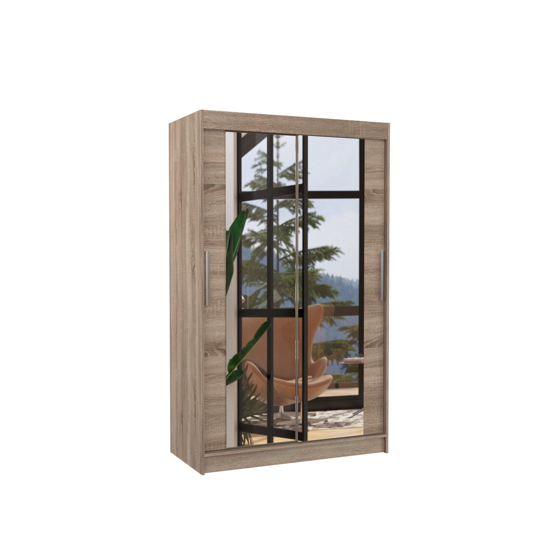 Раздвижной шкаф TIBAGO с зеркалом — идеальное решение для организации пространства. Он оснащен просторными полками и штангой для вешалок, на которых можно разместить платья, костюмы, верхнюю одежду или рубашки. Зеркала, прикрепленные к передней части, визуально расширяют пространство и добавляют стильный акцент. Благодаря раздвижной конструкции вам не нужно создавать дополнительное пространство для открытия дверей, что делает его идеальным решением для небольшой комнаты или узкого коридора.