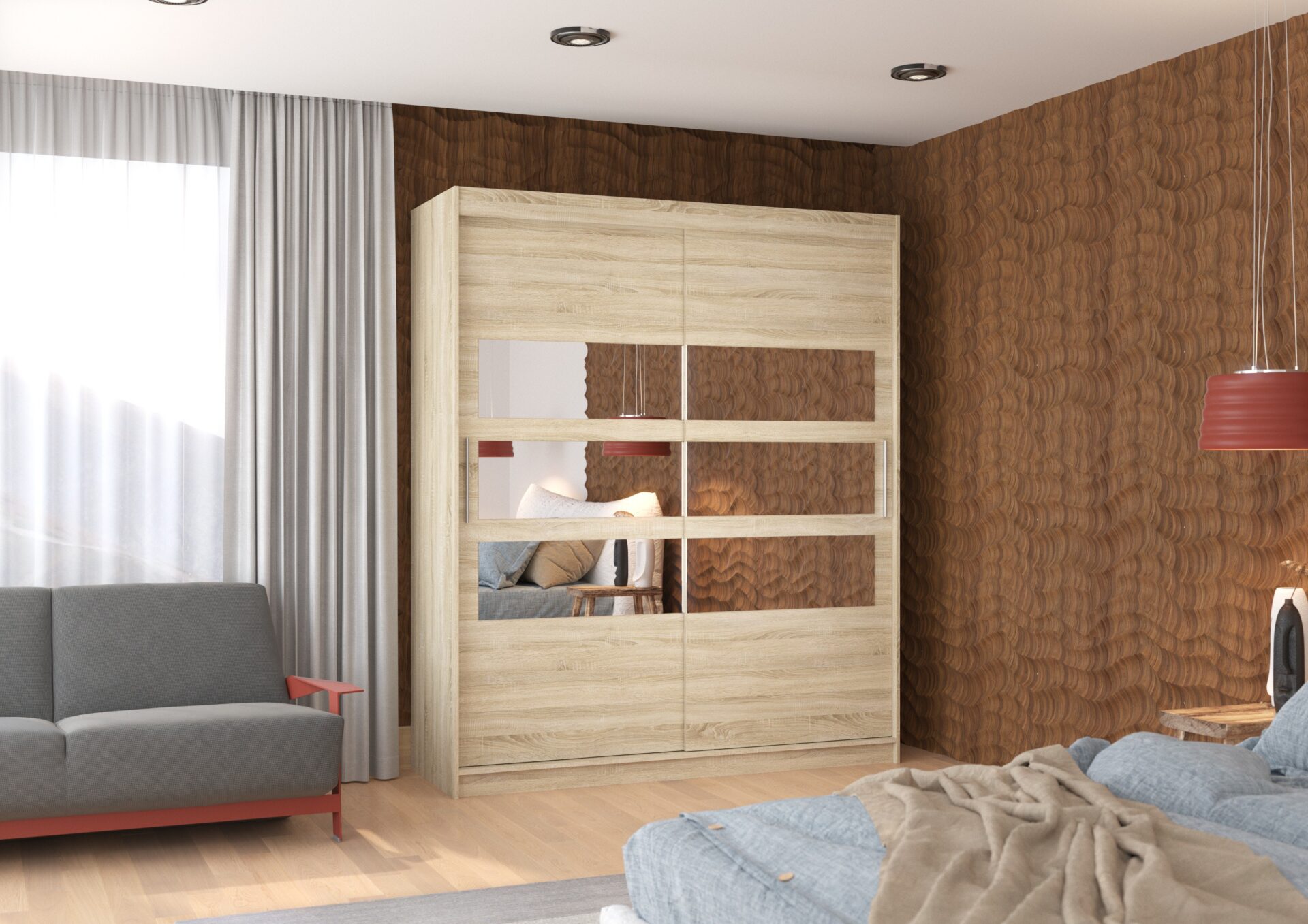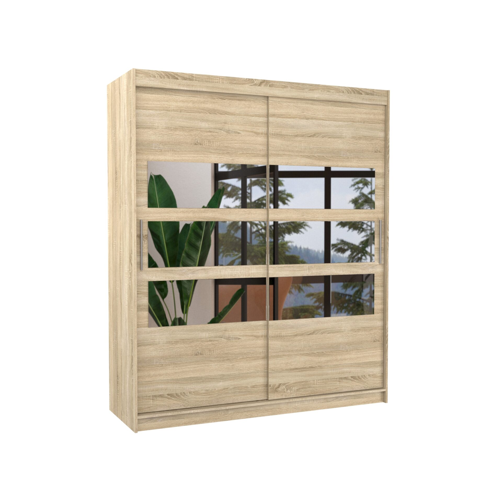 Раздвижной шкаф TOLEDO с зеркалом — идеальное решение для организации пространства. Он оснащен просторными полками и штангой для вешалок, на которых можно разместить платья, костюмы, верхнюю одежду или рубашки. Горизонтальные зеркала, прикрепленные к передней части, визуально расширяют пространство и добавляют стиля. Благодаря раздвижной конструкции вам не нужно создавать дополнительное пространство для открытия дверей, что делает его идеальным решением для небольшой комнаты или узкого коридора.